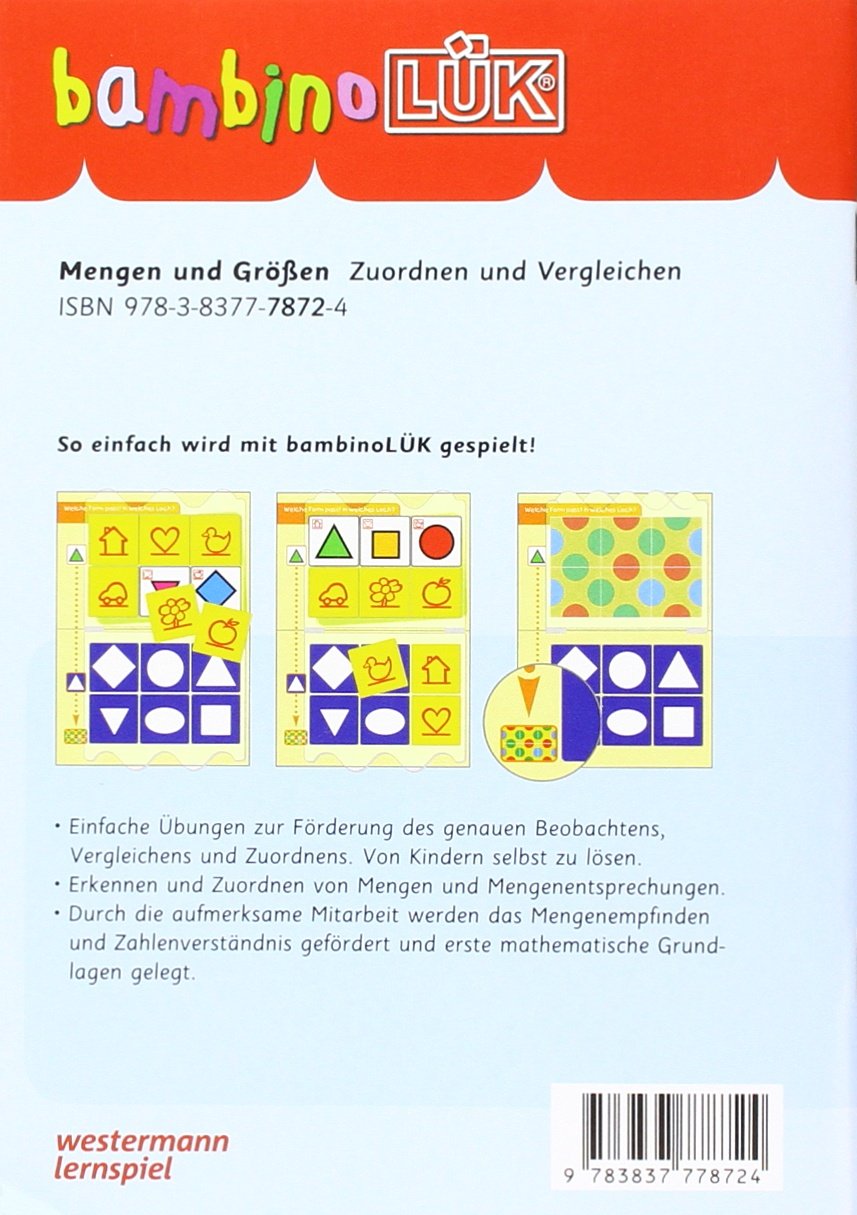 Kinder interessieren sich früh dafür, welche Dinge und wie viele davon um sie herum sind. Irgendwann fangen sie an, die Dinge zu zählen. Sie wollen wissen, wovon es mehr gibt ? oder weniger. Das bambinoLÜK-Übungsheft „Mengen und Größen“ macht Kindern Lust auf das Zählen und Vergleichen von Dingen. Das vertiefende Zählen gelingt so kinderleicht ? die optimale Vorbereitung auf den Umgang mit Zahlen und das frühe Rechnen .