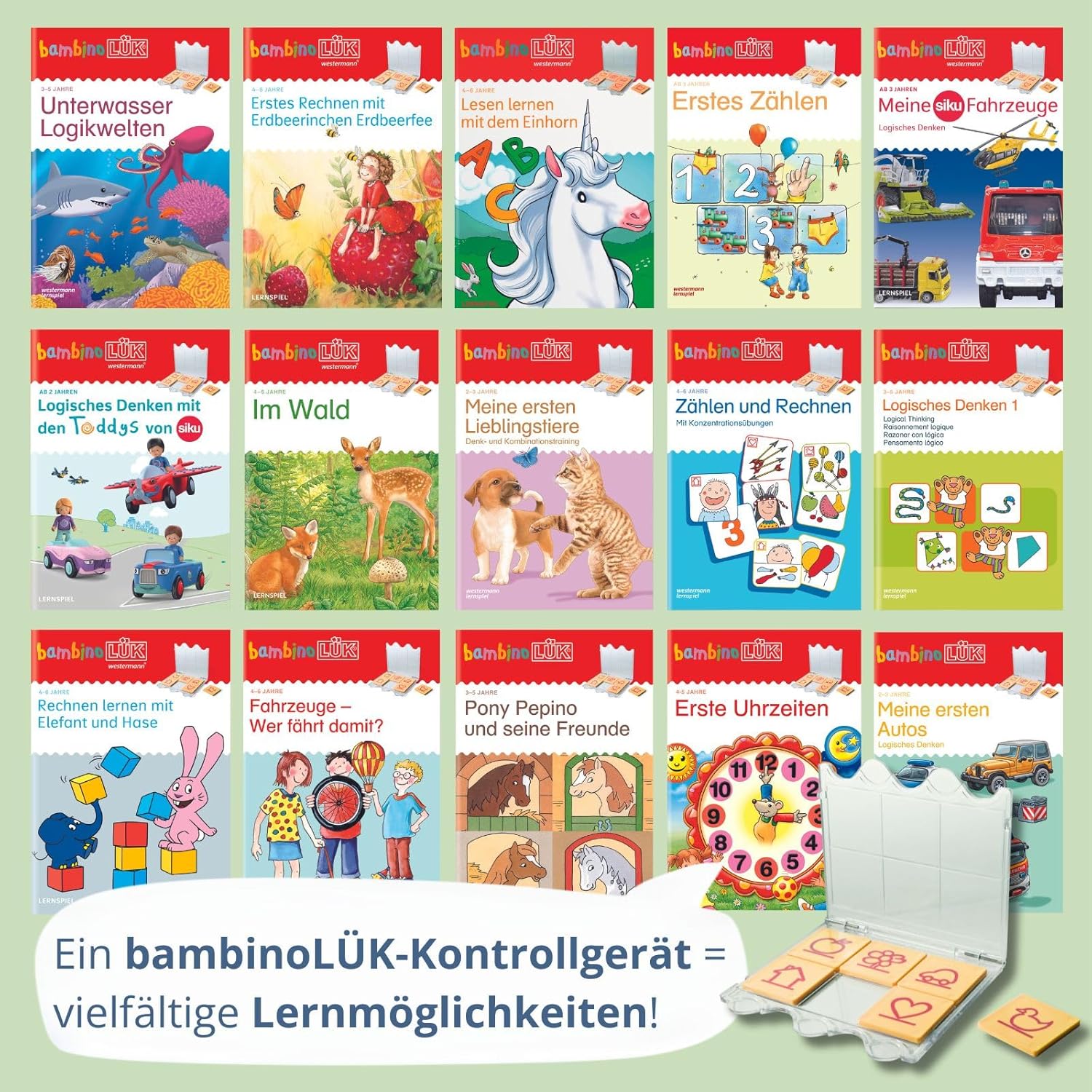 12 number plates. Control device with transparent lid in 5 different colours. Preschool play with hanging up and primary school play without laying up. More than 240 different exercise booklets. Nursery until the end of primary school characters: The mouse, Conni, Lotta and many more