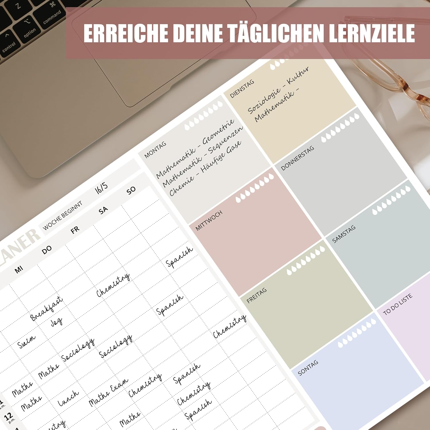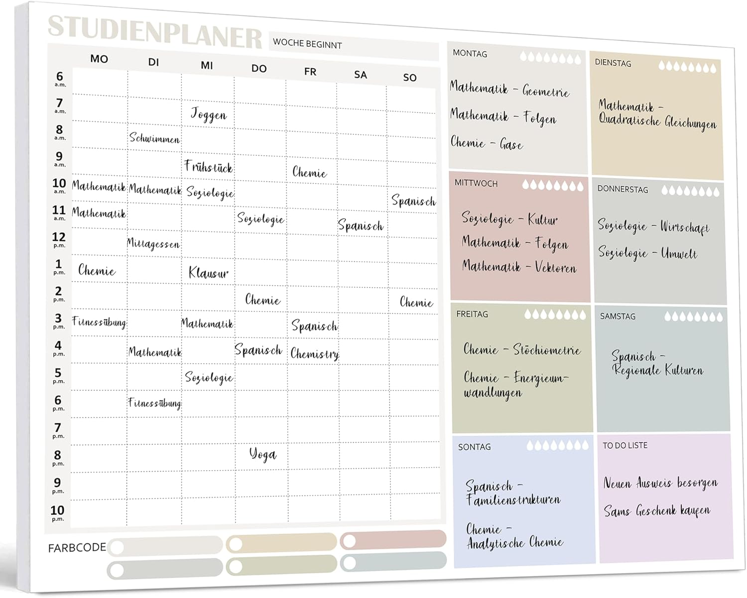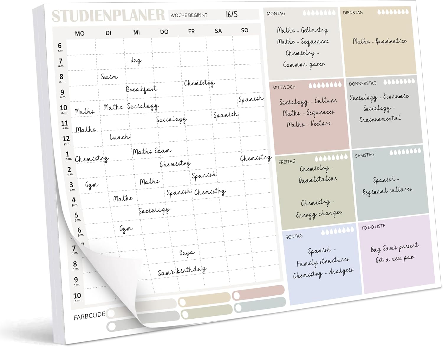 PERSONAL CUSTOMIZATION, PLANNING FOR A WEEK IS IN HAND: The weekly plan page is carefully designed and features a custom colorway. The respective day areas have a unique background colour, so that the days can be distinguished immediately. In addition, enough writing space is provided to write down the learning topics in detail, and learning progress is under control.