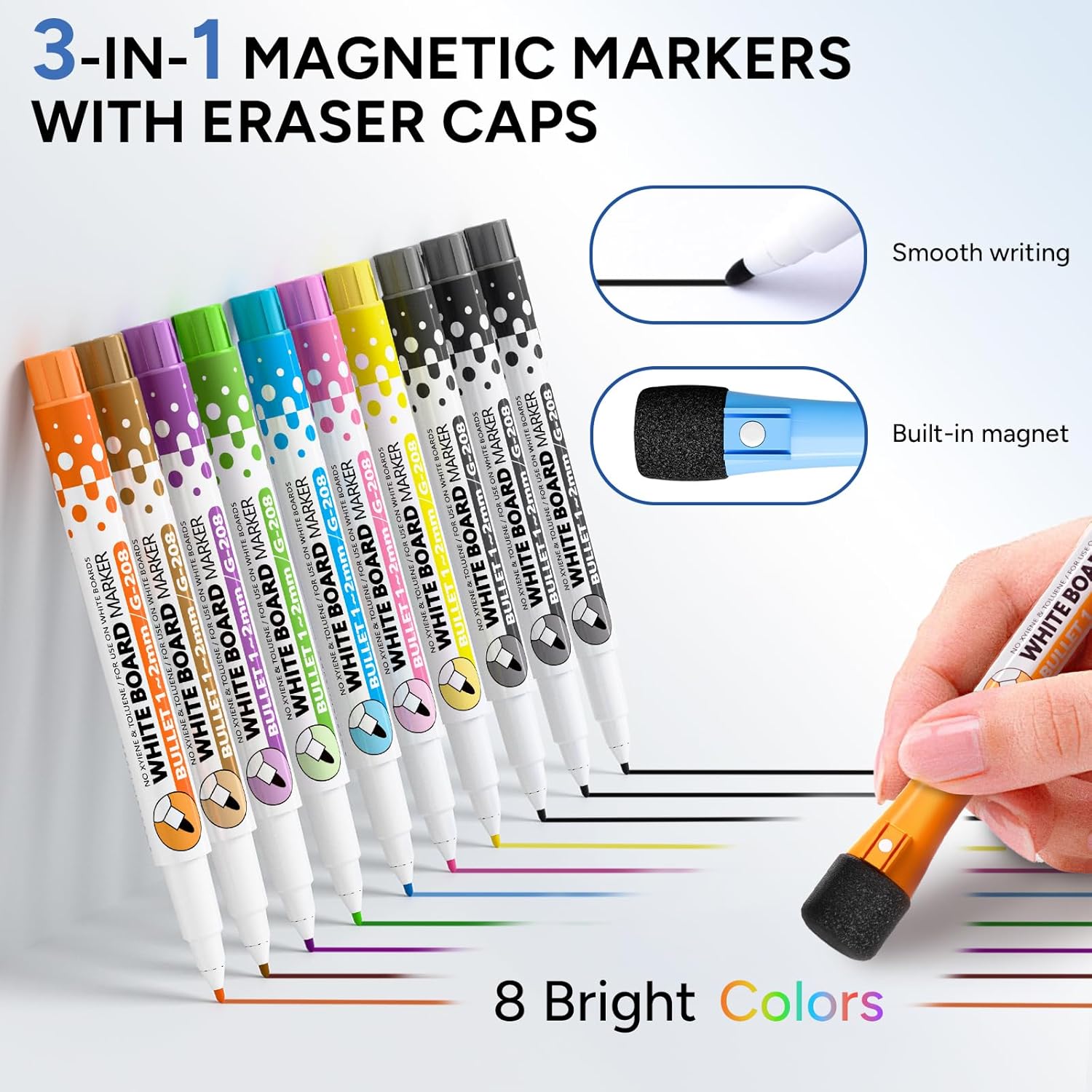 COMPLETE DRY ERASE SET This calendar board set includes 10 high quality magnetic markers, including 7 vibrant colors and 3 classic black, 6 powerful neodymium magnets, 1 convenient magnetic eraser and 10 sturdy push pins. Bottom cork strip securely holds notes, memos and photos with the included push pins