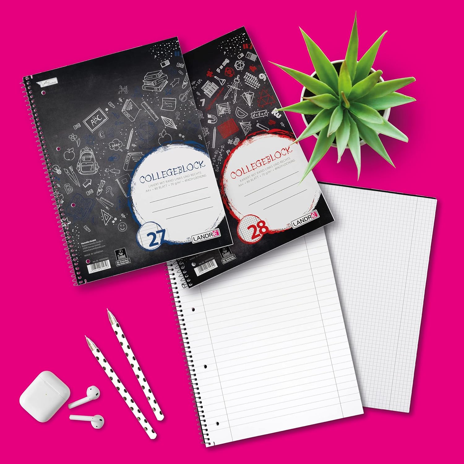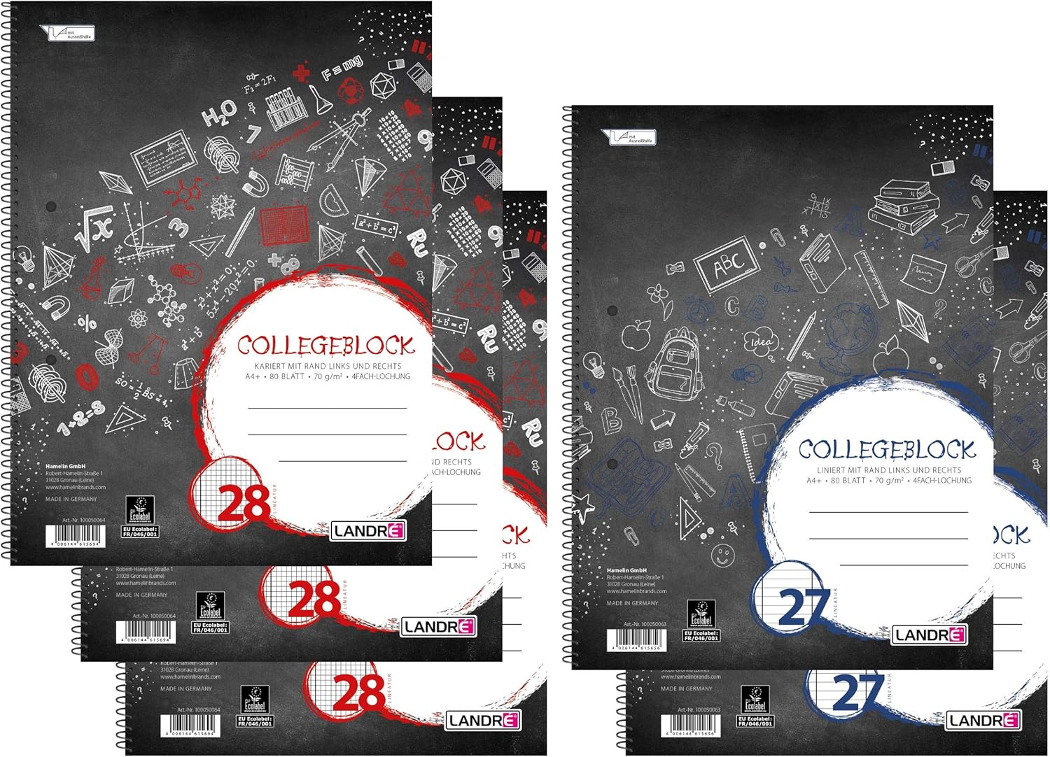 You will receive 3 squared college blocks and 2 lined college blocks each with a margin left and right. The pads are equipped with a rising spiral on the long side and reinforced with a cardboard back.