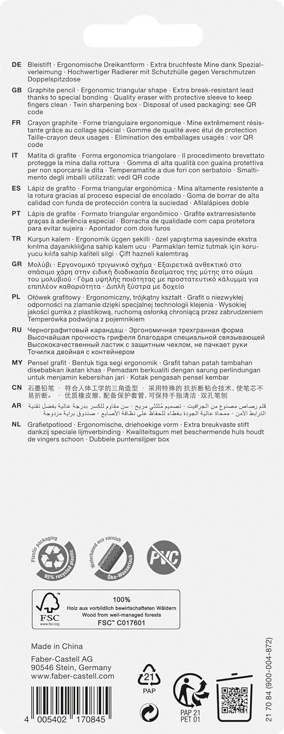 The gift set sleeve from Faber-Castell is an ideal combination for writing enthusiasts and creatives. Included are three Grip 2001 pencils, a high quality sharpener and a reliable eraser. The ergonomic triangular shape of the pencils ensures a comfortable writing experience, prevents fingers from slipping and allows fatigue-free writing. The patented soft-grip zone ensures a secure grip throughout the writing process. The lead of these pencils is particularly shatterproof, as it is completely glued to the wooden sheath. With a hardness of B and an environmentally friendly water-based paint, the pens offer optimal writing performance while being sustainably manufactured. The enclosed sharpener is suitable for all standard pen shapes of coloured and pencils and allows a precise and clean tip. The PVC-free eraser with protective cover completes the set, allows smear-free and precise erasing and contributes to a clean correction. This sleeve set is an ideal gift for students, artists and anyone who enjoys writing and drawing. Other items can be found in our brand shop. Click on the brand name Faber-Castell below the product title.