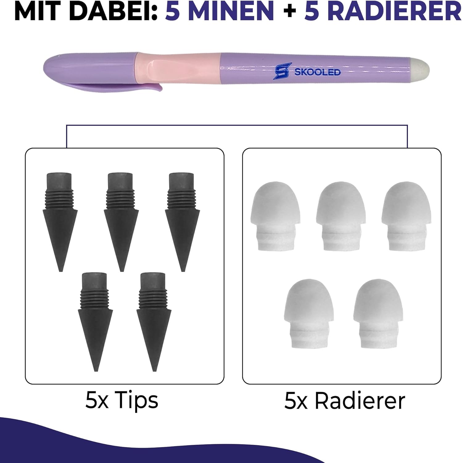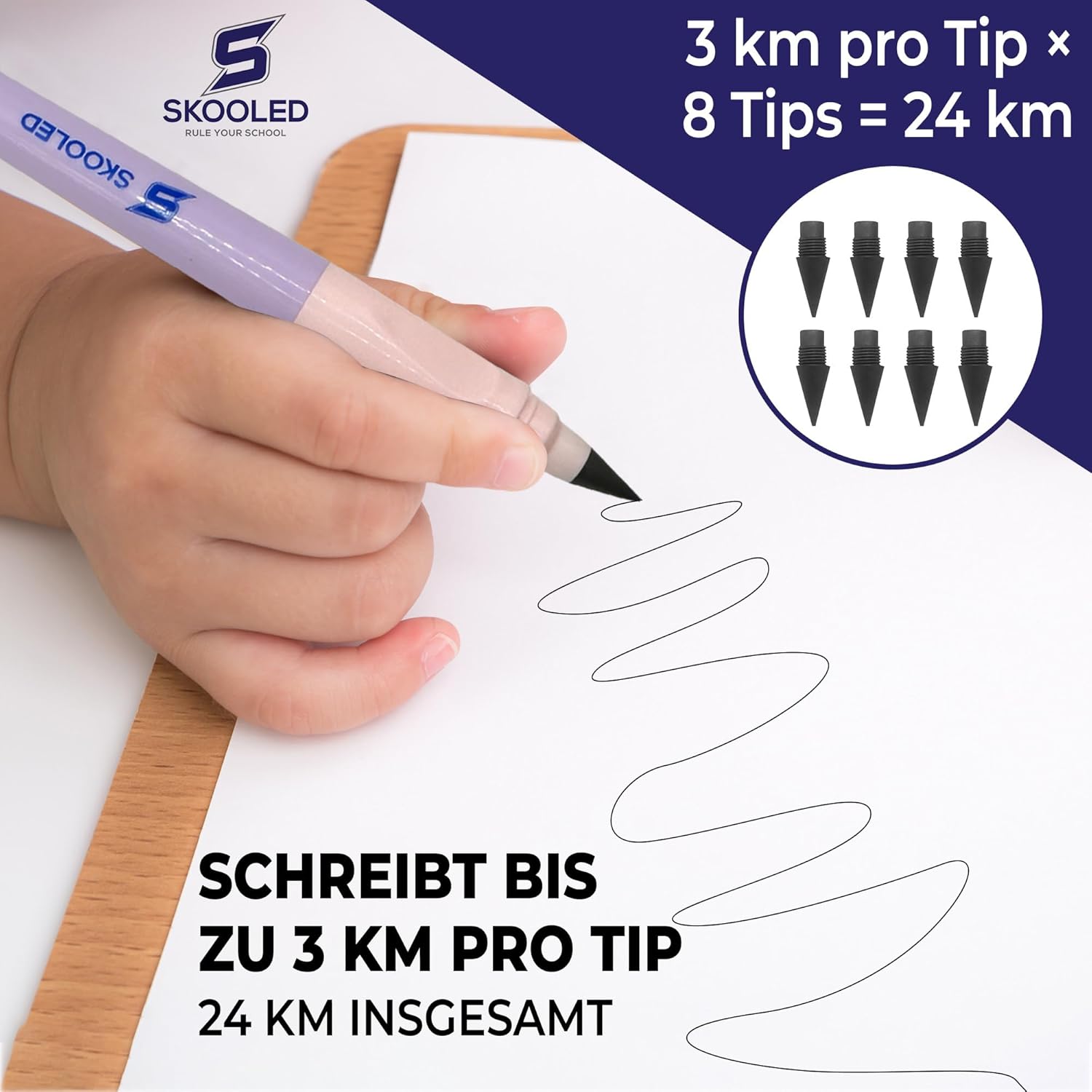 Never sharpen again – always ready: Schreibheld writes up to 24 km thanks to interchangeable leads (3 km per lead, 8 leads included).
