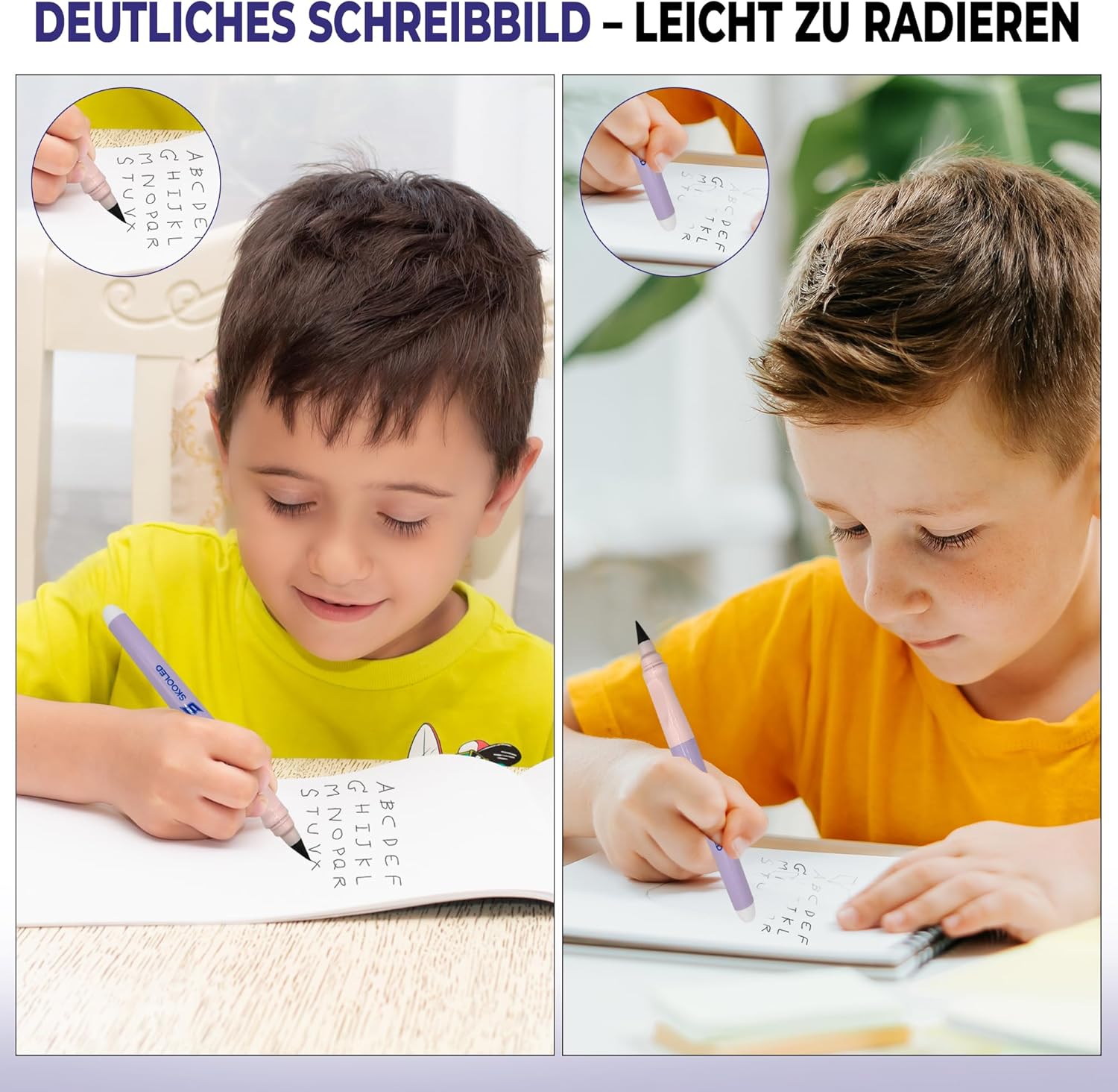 The writing hero – the pencil that revolutionises everyday school life. No more tips, no blurred lines, no lost pen – with the innovative writing hero you bring order, efficiency and joy to any pencil case. Thanks to 6 interchangeable refills, each writing up to 3 km, the writing hero accompanies your child through many months or even years of school time. The ergonomic three-point handle supports a healthy hand posture and optimally prepares for the transition to the fountain pen – perfect for the 1st to 3rd Class. The specially compacted writing material ensures a particularly clear typeface without smudging – ideal for left- and right-handed users. The built-in eraser works reliably when the pen is held vertically – simply flip over and correct cleanly. Each set contains 3 pens in beautiful colours, 5 refills, 5 spare erasers and 10 name stickers for personalisation – to keep your school table tidy. The typeface of this pen is deliberately slightly brighter than a conventional pencil. Especially for use in primary school, this is an advantage: children can erase their writing easier and cleaner – ideal for practicing, correcting and learning.
