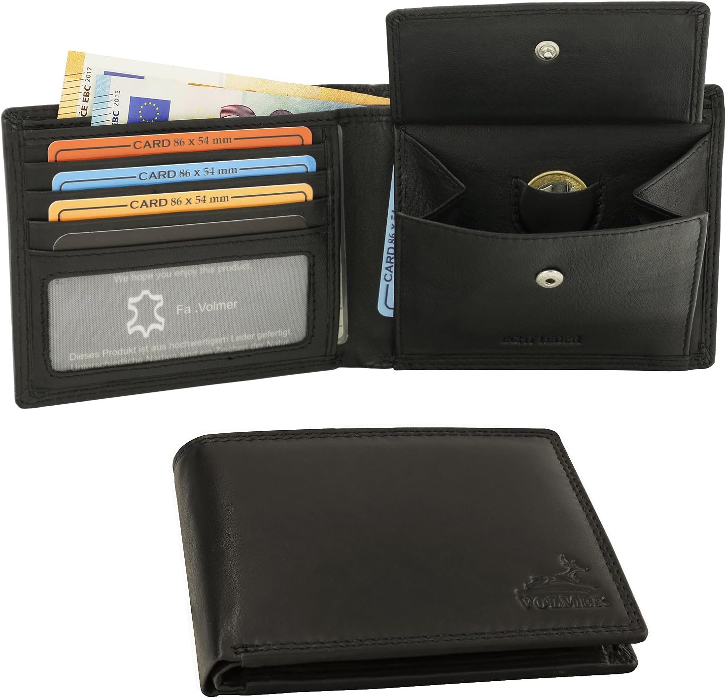 High-quality: At Fa.Volmer, we focus on the wallet, which is made from robust Nappa cow leather and features extra-robust double stitching on the outside. The wallet has a built-in RFID protective film, which protects your data from data theft and unwanted reading.