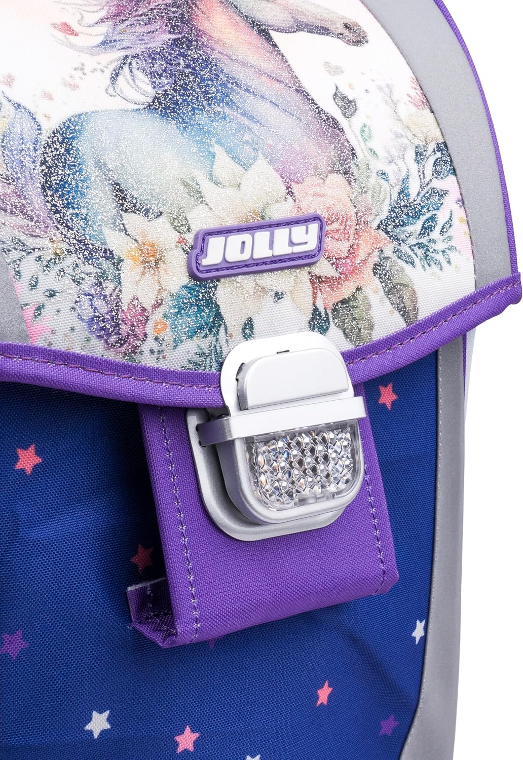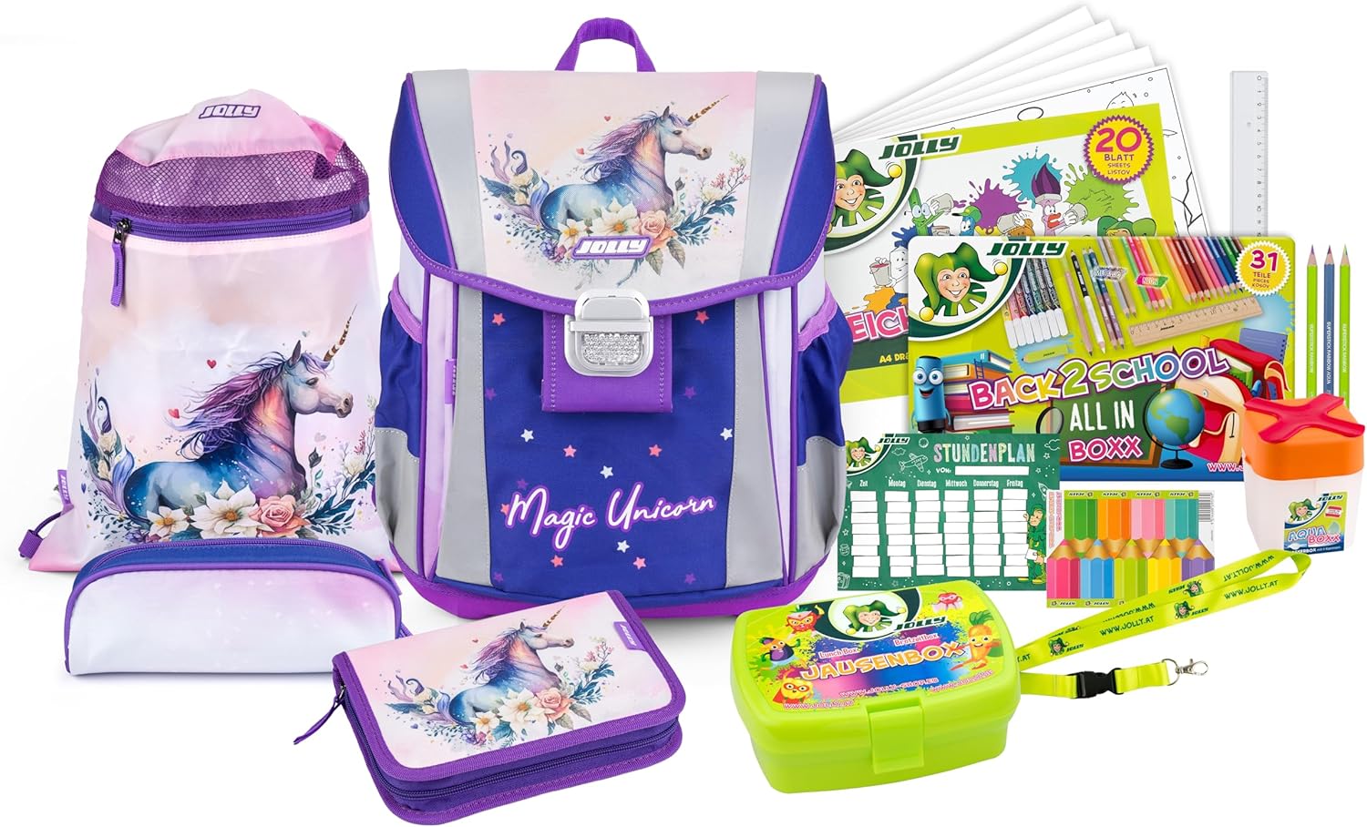 The JOLLY Classic school bag set, consisting of 46 pieces, represents the ideal starter kit for school children entering school life. It is characterised by a child-friendly design that not only appeals visually, but also impresses with practical aspects such as reflective strips that increase safety on the way to school. In addition, the carrying system is ergonomically designed to protect the children’s back even when fully loaded and ensure a high level of comfort. Included in this comprehensive set is a durable school bag equipped with adjustable straps to allow individual adjustment to the size of the child. The bag’s generously sized inner compartment provides ample space for all school supplies, while specially designed compartments for books and timetables allow for structured organization and easy access. In addition to the school bag, the set also includes a practical gym bag, which can be used for sports lessons or extracurricular activities. Other equipment includes high-quality stationery and various useful accessories that make the start of school a special experience for every child. These additional utensils are carefully selected to meet the demands of everyday school life and promote children’s creativity and willingness to learn. With the JOLLY Classic school bag set, school children not only get a visually appealing and functionally sophisticated school bag, but also complete equipment that optimally prepares them for their new stage of life at school.