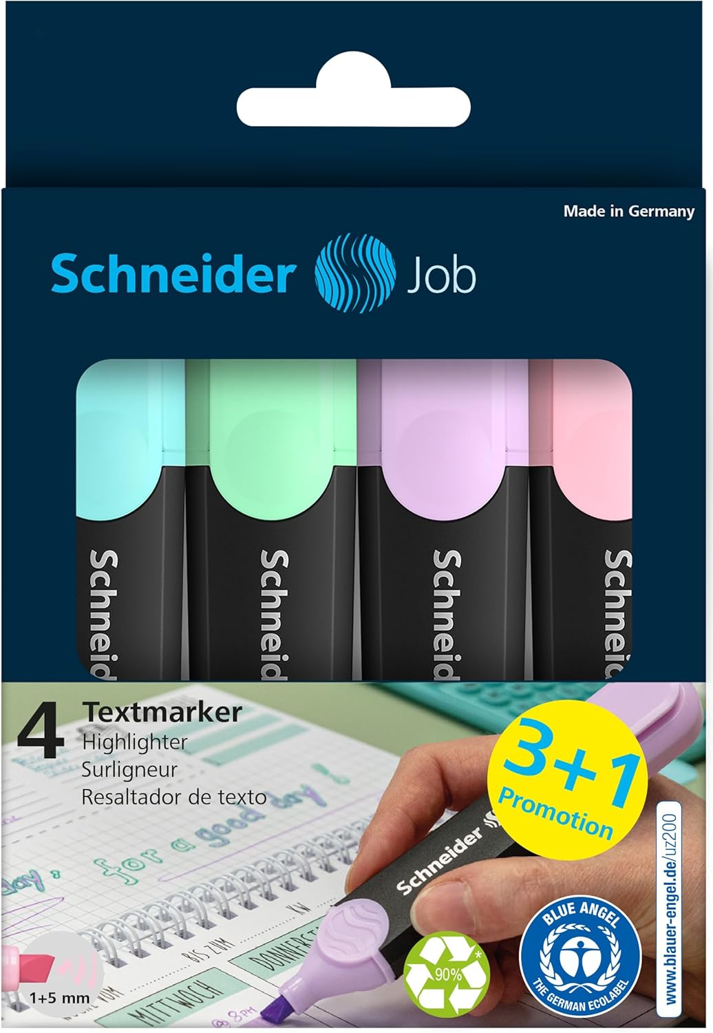 Ich bin absolut begeistert von diesem Pastell-Textmarker-Set! Die Keilspitze ermöglicht sowohl feine (1 mm) als auch breite (5 mm) Markierungen – ideal für präzises Unterstreichen oder Hervorheben ganzer Textpassagen. Die Kappe mit Clip ist praktisch und lässt sich einfach umstecken.Das Design ist durchdacht: Die flache Form mit abgerundeten Ecken passt perfekt in jede Tasche oder Schlaufe, ohne aufzutragen. Besonders gefällt mir die Universaltinte in trendigen Pastellfarben – sie leuchtet angenehm, ohne zu grell zu sein, und funktioniert super auf Normal-, Kopier- und Faxpapier.Ein großes Plus: Gehäuse, Spitze und Tintenspeicher bestehen aus recyceltem Kunststoff, und die biobasierte Tinte ist ein klares Zeichen für Umweltbewusstsein. Dass der Schneider Job 150 mit dem Blauen Engel ausgezeichnet wurde, unterstreicht die nachhaltige Qualität.Im Set sind sechs wunderschöne Farben enthalten: Türkis, Mint, Flieder, Rosé, Pfirsich und Vanille – alle dezent, stilvoll und perfekt kombinierbar.Fazit: Umweltfreundlich, hochwertig und stilvoll – diese Textmarker sind ein Must-have für alle, die Wert auf Qualität und Nachhaltigkeit legen!