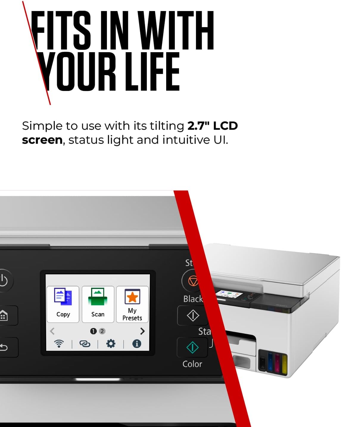Compact design: Place this small office printer in compact spaces or on walls, thanks to its full front operating design for easy access. Easy to use with its tilting 6.7 cm LCD touch screen, status light and intuitive user interface.