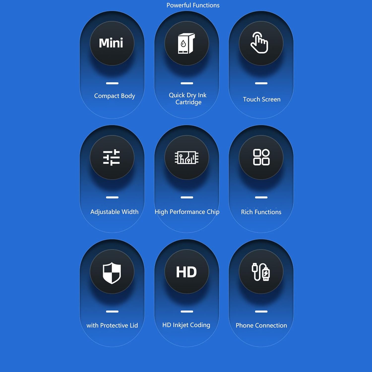 Vielseitiges Drucken: Dieses tragbare Codiergerät erfüllt verschiedene Druckanforderungen, z. B. Text, Zahlen, Symbole, QR-Codes, Barcodes, Bilder, Uhrzeit, Datum, Etiketten usw.