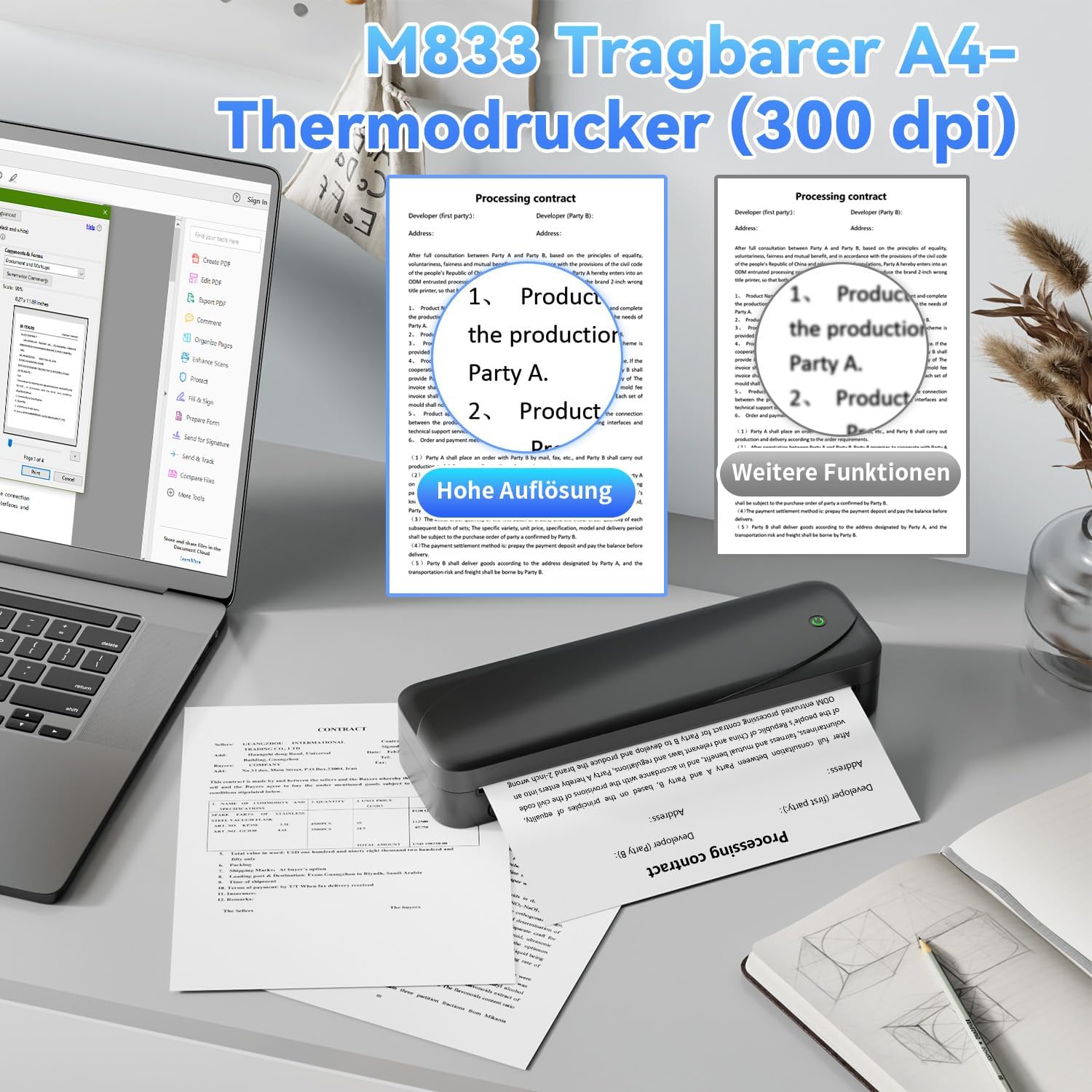 300DPI inclusive thermal printer: With a high resolution of 300DPI for crisp, clear and blur-free prints, the Phomemo M833 wireless portable printer a4 prints tickets, invoices, documents, contracts, files and photos in high resolution. Ink and toner-free thermal printing technology saves money on expensive ink cartridges and makes printing more efficient, convenient, tidy and cleaner