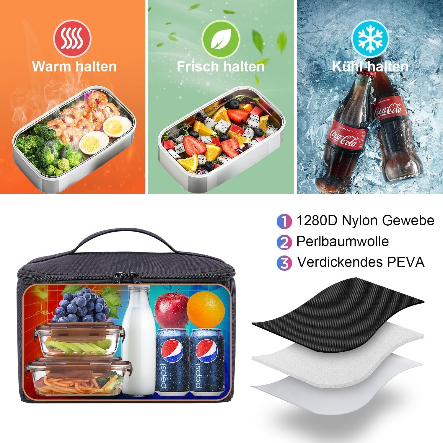 2-in-1 design: the backpack features a versatile 2-in-1 design. The inner folding wall and sturdy closure provide stability and prevent food from being squeezed by heavy objects. If you do not want to carry food, you can simply fold the folding wall and get a spacious large backpack (dimensions 32 x 20 x 50 cm) that provides additional storage space for your items.