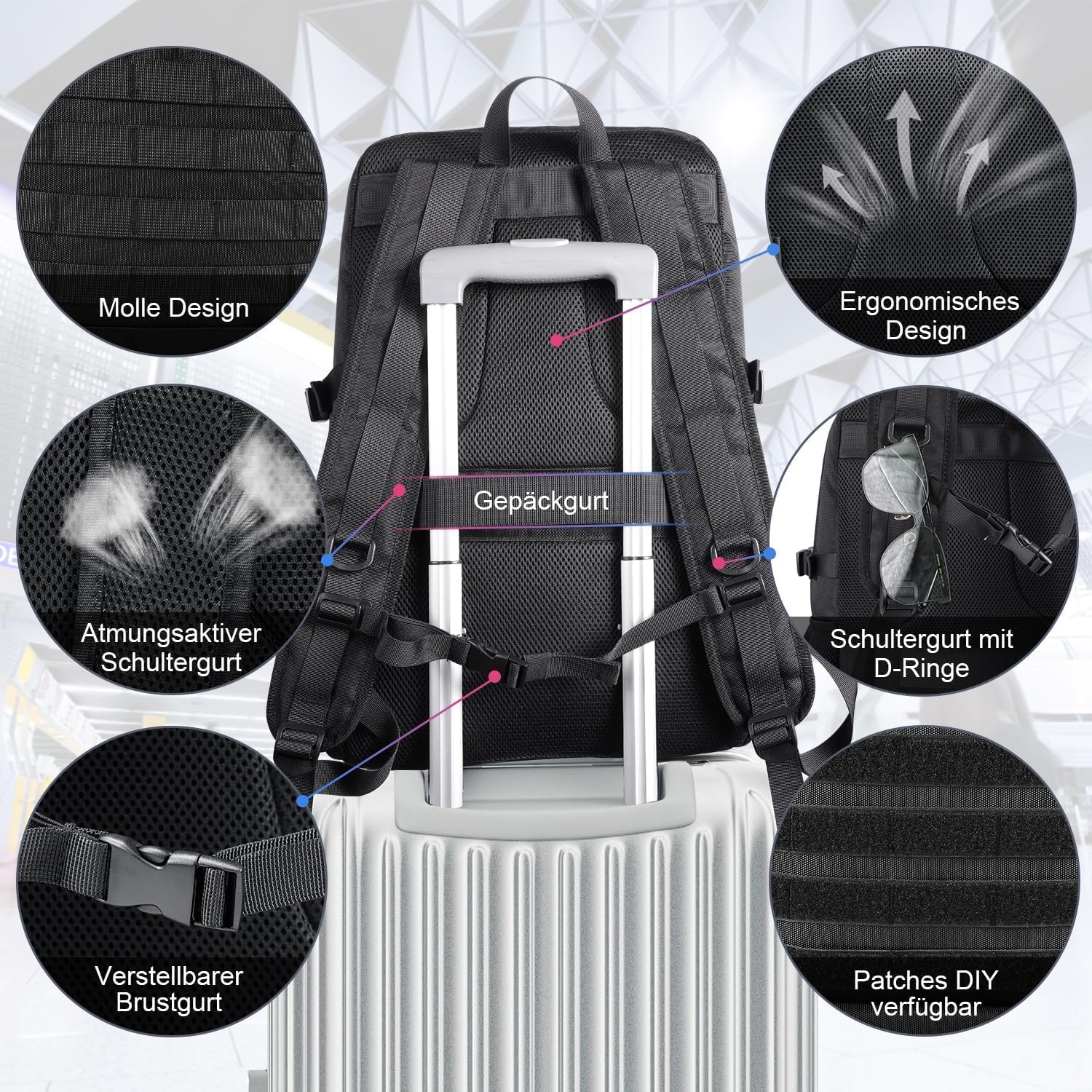 Comfortable to wear: The shoulder straps and back area of the backpack are made of soft and breathable material to ensure a high level of comfort and good ventilation. The luggage strap design allows you to securely attach the backpack to a suitcase, thus relieving your shoulders during your trip.