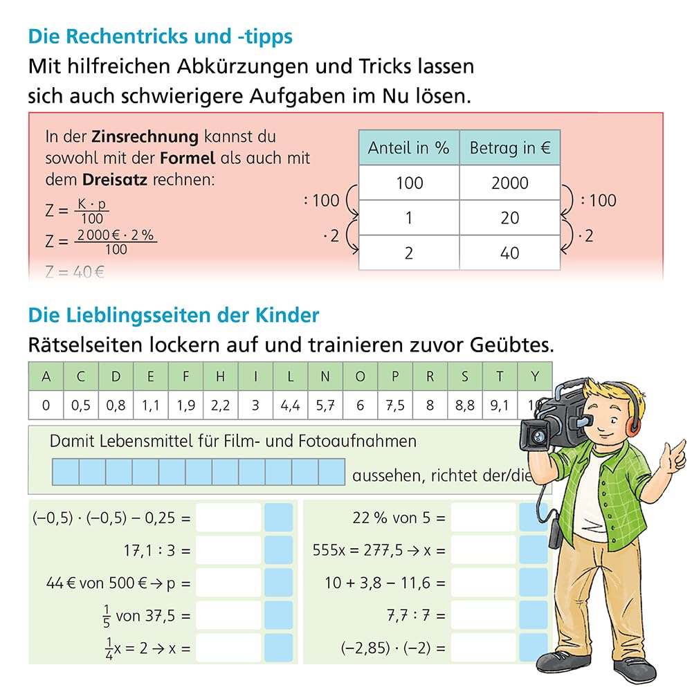 Immer wiederkehrende, selbsterklärende Übungsformate ermöglichen das selbstständige Bearbeiten.Hinweise und Anleitung zu Rechenstrategien erleichtern den Zugang.Spielerische Aufgaben mit Rätselcharakter motivieren zusätzlich.Mathe-fit-Testseiten ermöglichen in regelmäßigen Abständen, die Lerninhalte selbst zu überprüfen.