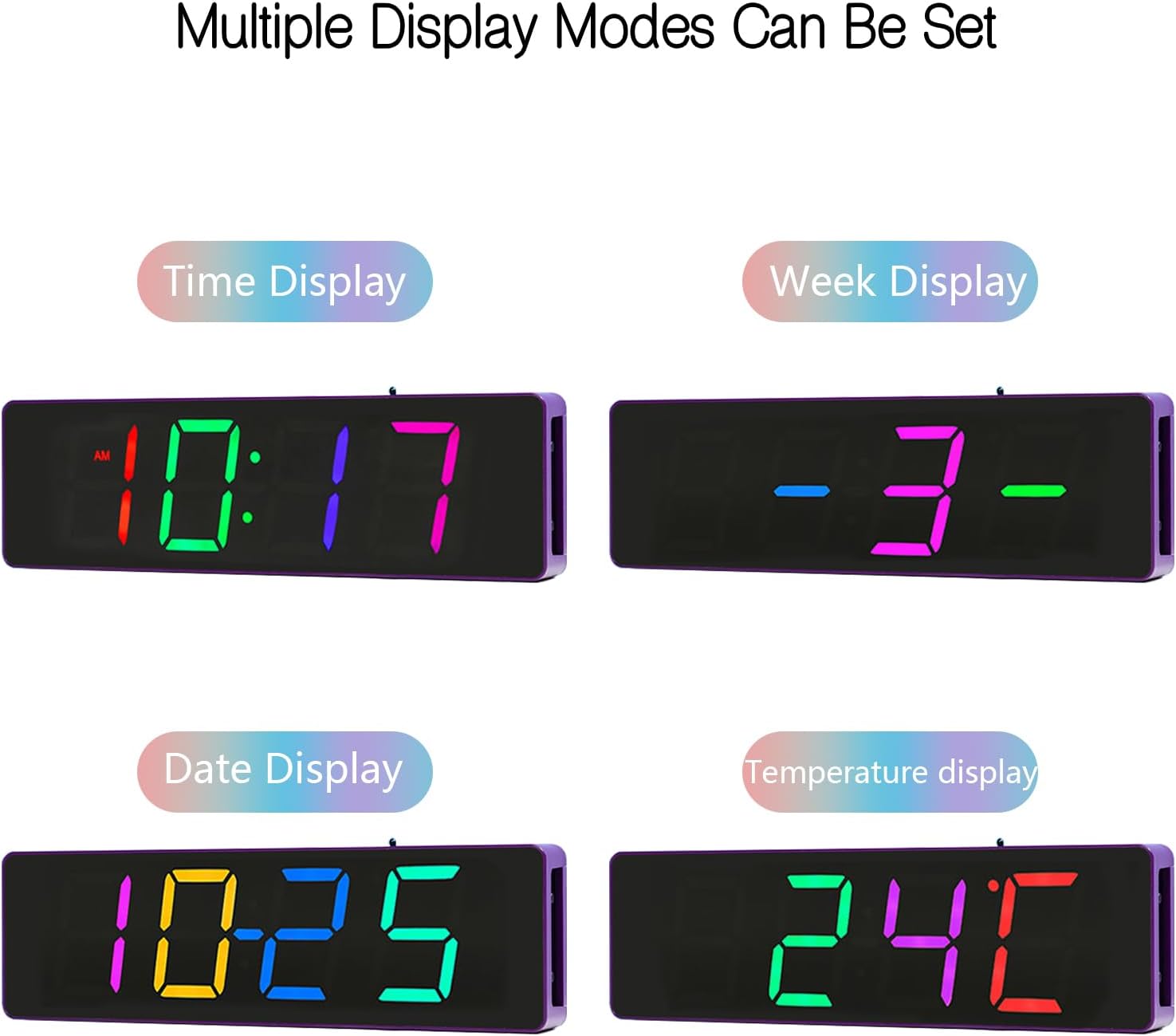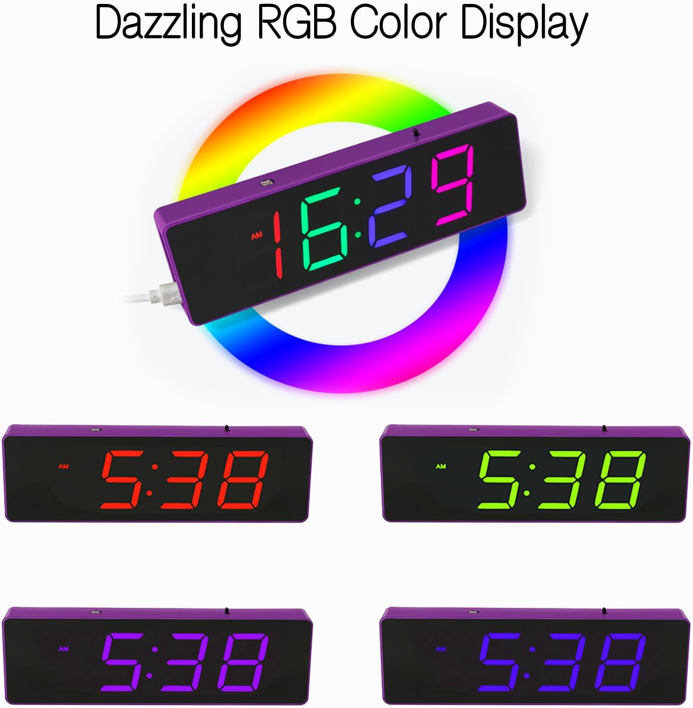 Rich in functions: 1. Time Display:Support the 12-hour system/24-hour system with free switching to meet different needs. 2. TEMPERATURE MONITORING Accurately measures indoor temperature so you can always keep track of environmental changes. 3. Date display: including year, month, day and week to provide comprehensive time information. 4. Alarm setting: supports setting 3 alarm groups, which can be selected to ring every day, weekday or weekend to avoid repeated settings.5. Choice of colours: colourful RGB LEDs