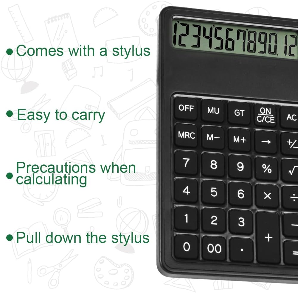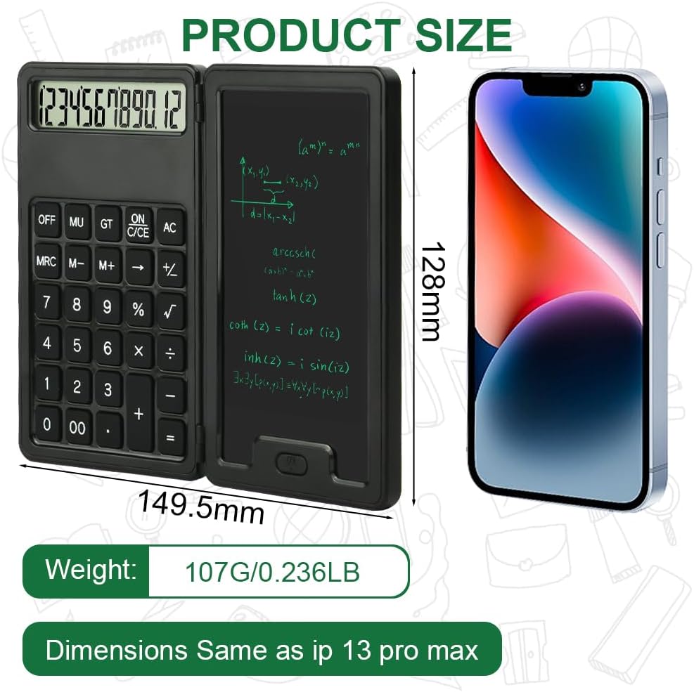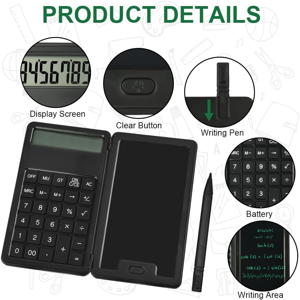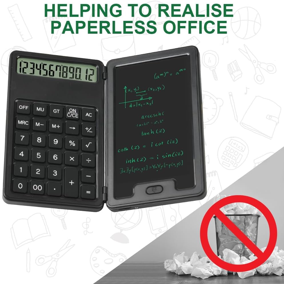 Multifunctional calculator: Equipped with an erasable 5 inch LCD writing pad and a plug-in pen, you can take notes or charts at the same time. The clear 12-digit display value improves efficiency and facilitates calculations. The LCD screen has no blue light and no backlight, which makes writing more comfortable and protects your eyes.
