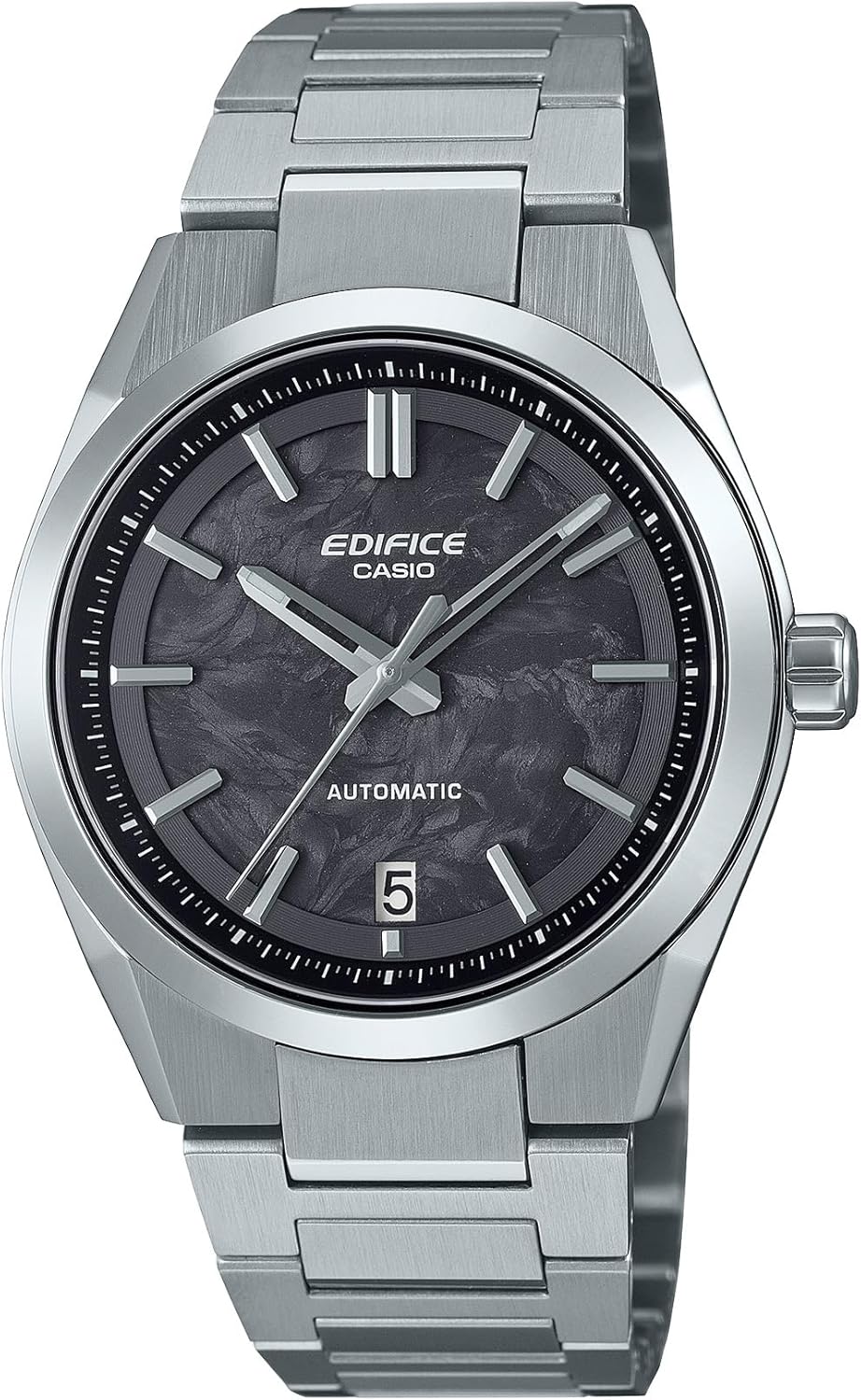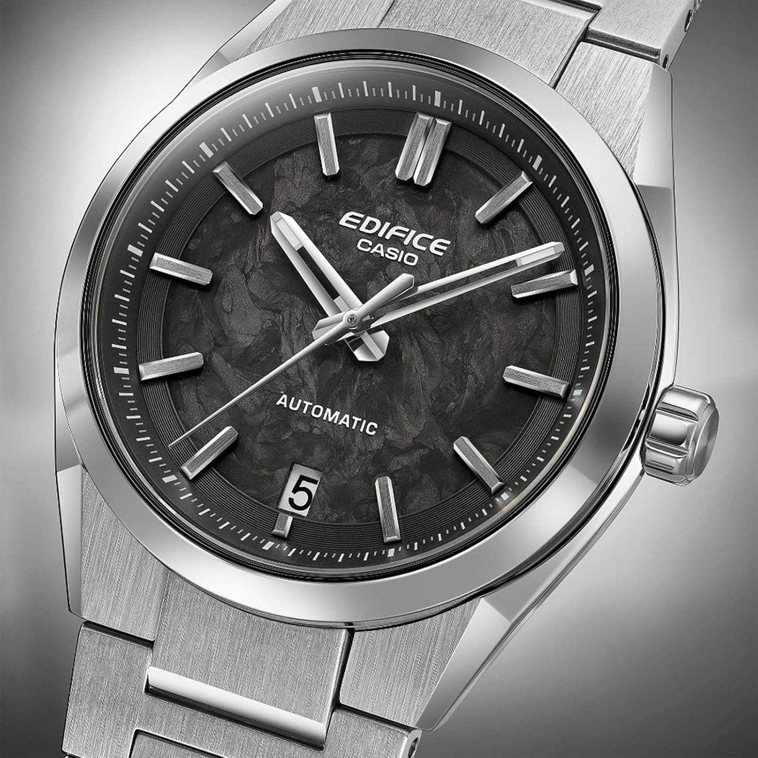 Distinctive watch for men, mechanical movement with automatic winding, power reserve approx. 40 hours, date display, forged carbon dial, luminescent hands, ground indexes, central second hand, solid stainless steel case, polished, surface partly frosted, screwed glass case back, ribbed crown, scratch-resistant sapphire crystal glass, frosted stainless steel bracelet with polished details, length-adjustable safety clasp with logo engraving, waterproof up to 10 bar, case size (L x W x H): 43. 5 x 39x 12.5 mm