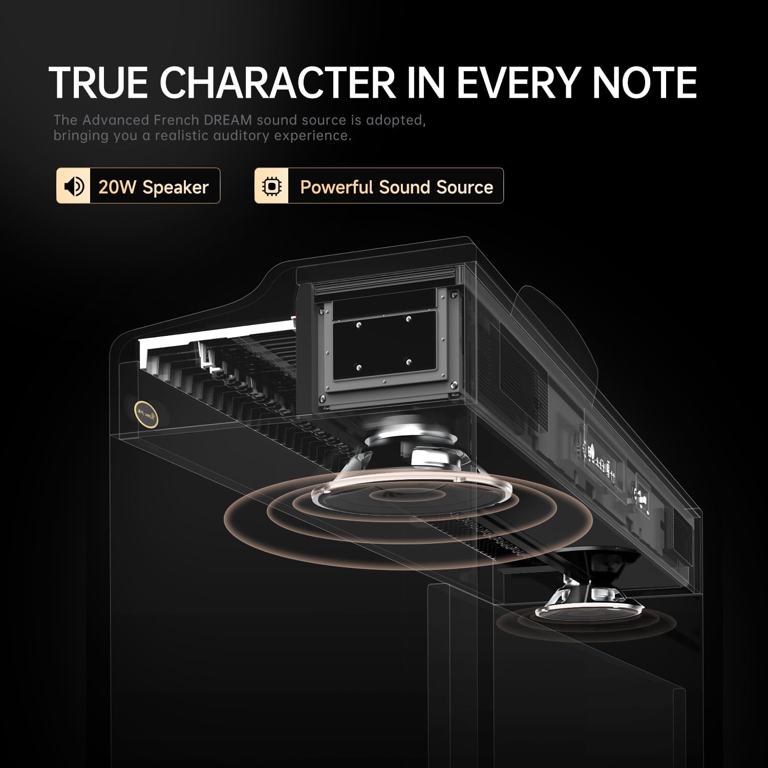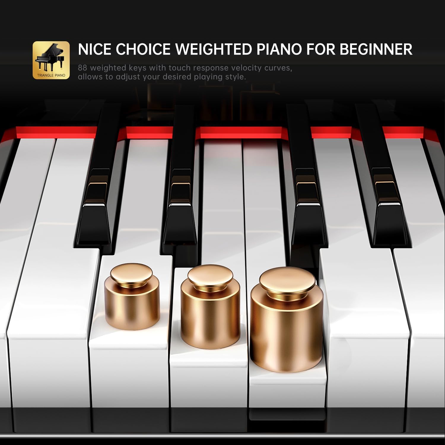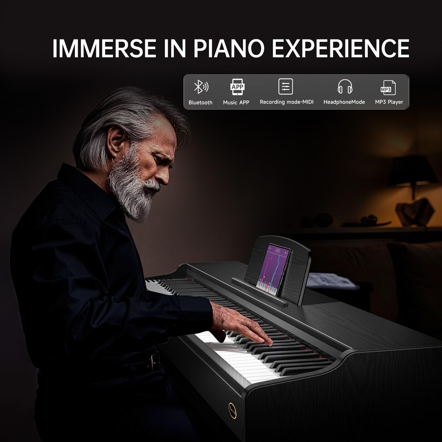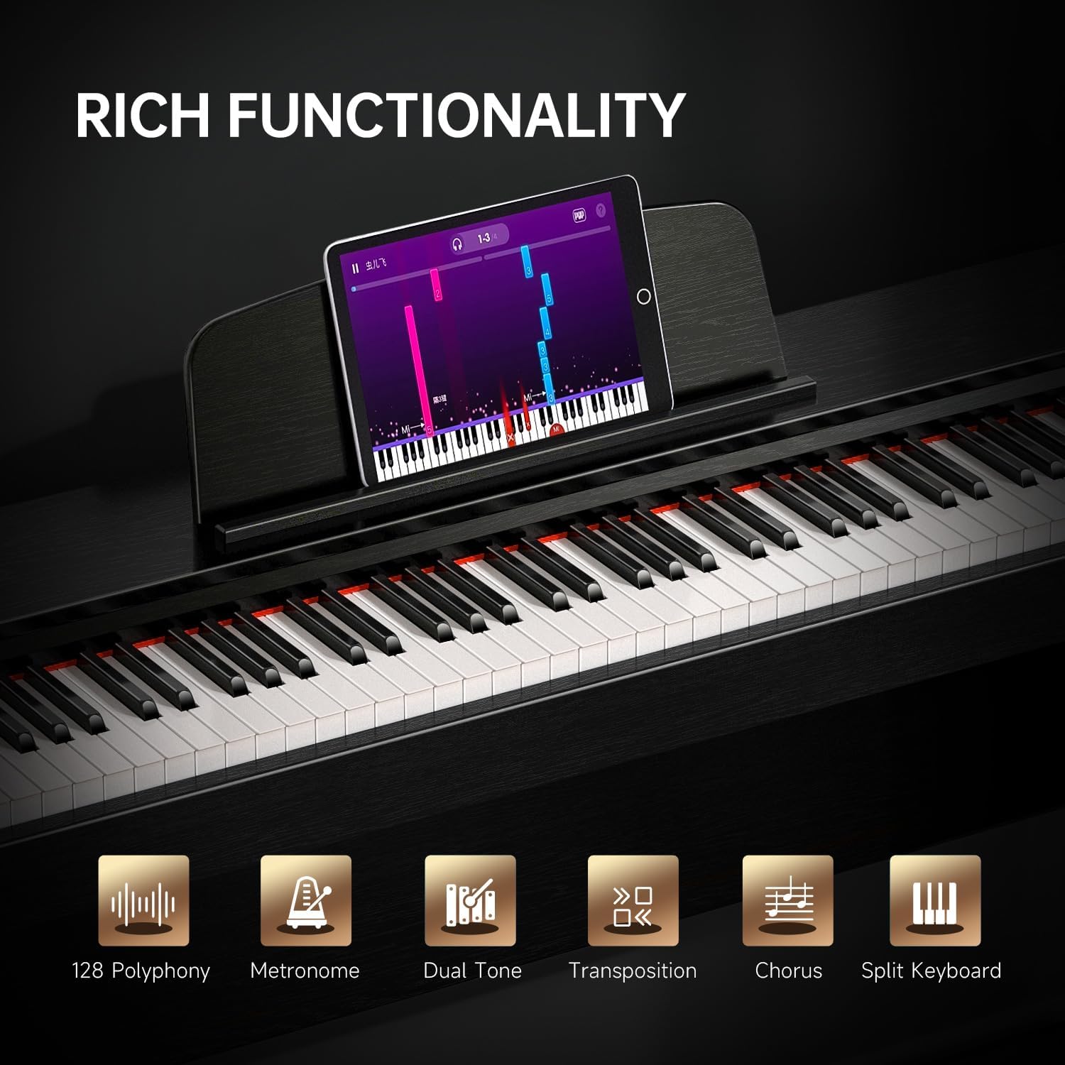 128 Tones & 128 Polyphony: 88 keys weighted keyboard with 128 notes max polyphony, 128 timbres, 100 rhythms and 88 demo songs, players could distinguish sound clearly in chorus and reverb among different occasions.