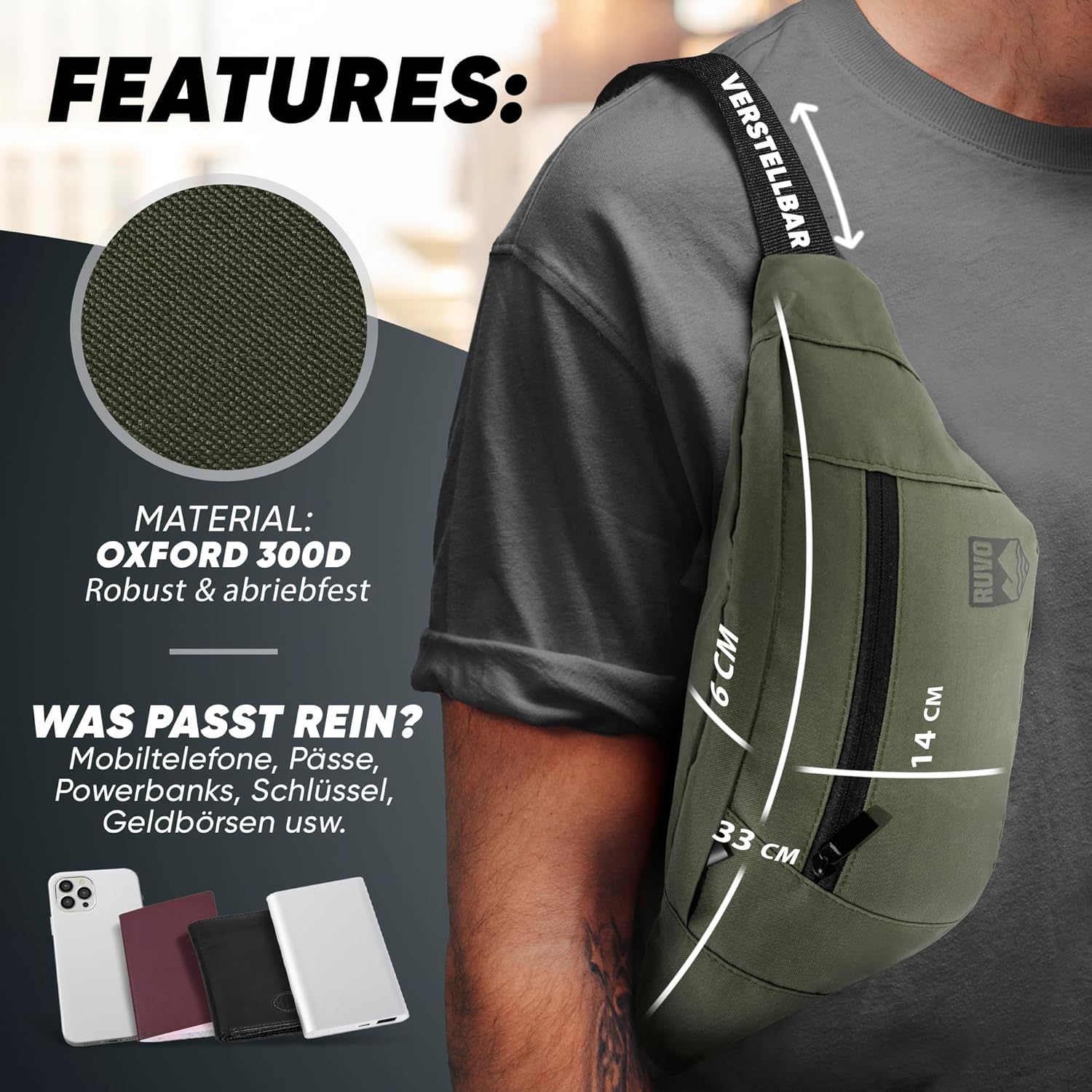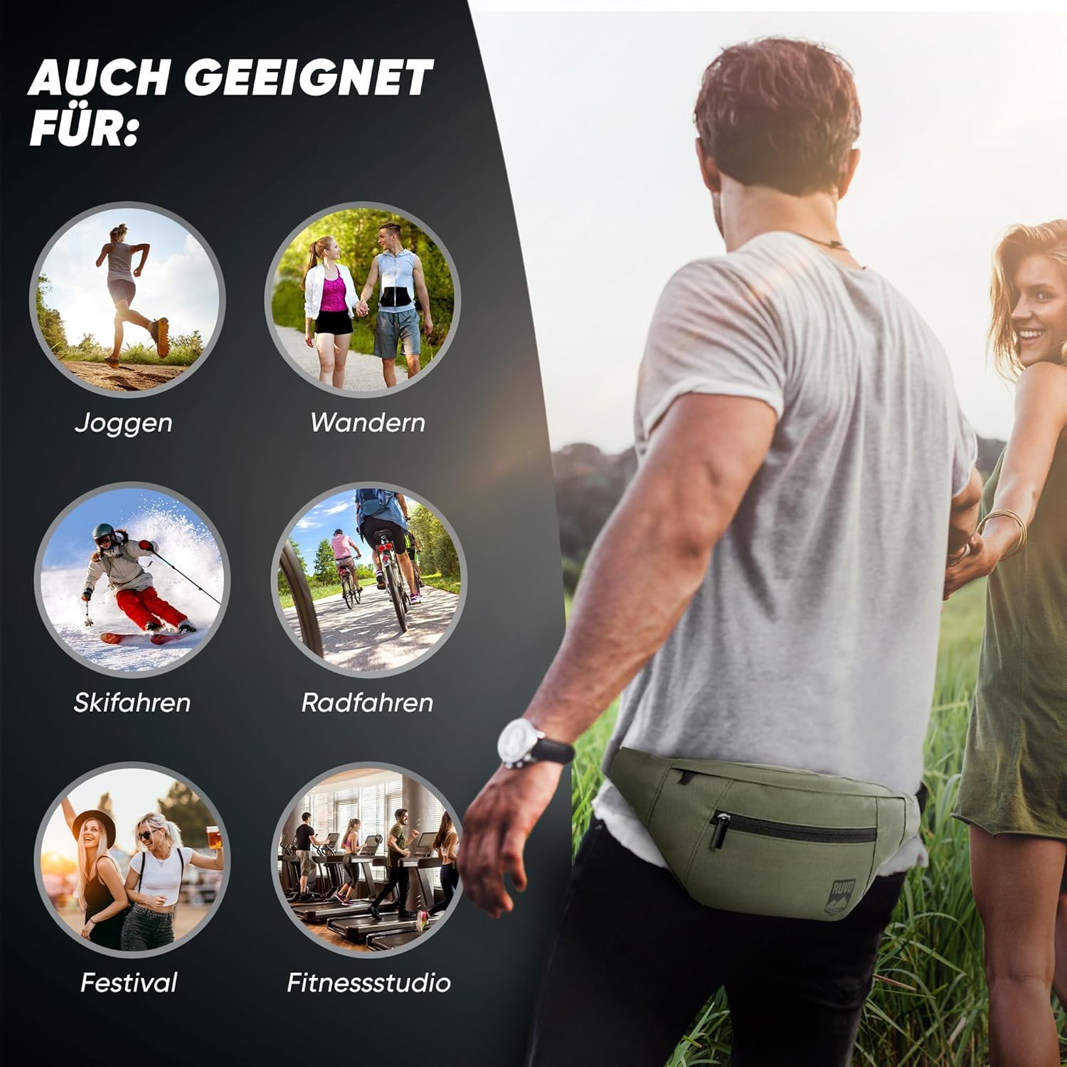Be the first to review “RUVO Bum bag for men and women, stylish belt bag for maximum storage space, 4 compartments, each with zip, suitable for all activities”