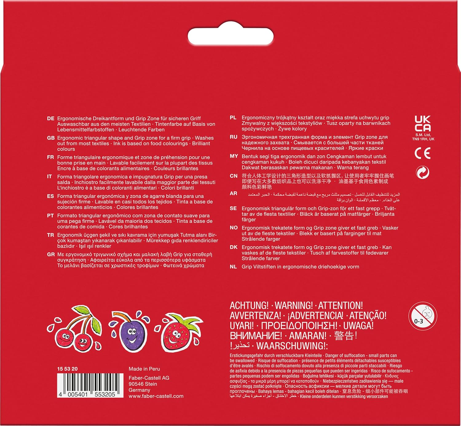 The Faber Castell Grip Colour Marker has an ergonomic triangular shape with a nub surface that ensures a secure, non-slip and comfortable grip. The ink colour is based on food dyes. The durable tip can withstand up to 3 kg of painting pressure. The bright colours are washable from most textiles. The case contains 20 different colours.