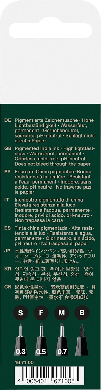 Each Pitt Artist Brush Pen uses the best permanent ink of the highest quality, which is acid-free and archivable. The waterproof ink contains high quality pigments with unsurpassed lightfastness. The quality brush provides flexibility for sketching or detail work.