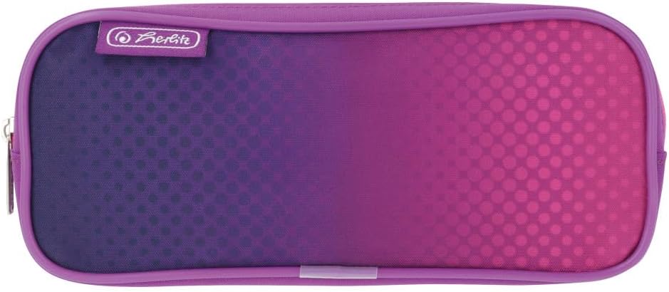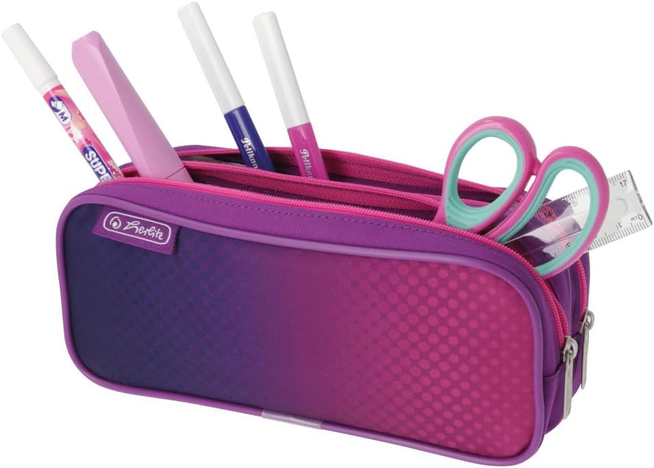 Material: polyester; 2 main compartments with zip; companion for school; university; work or leisure; handy; dimensions: 20.5 x 7 x 9 cm; easy to transport; 4 assorted designs: pink/purple.