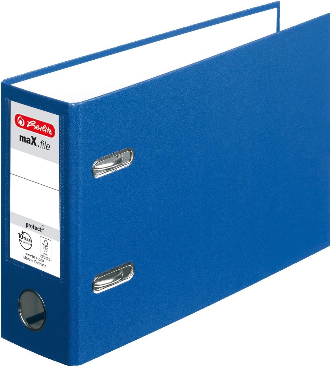 Folder maX.file protect A5 landscape 8 cm black, blue or red. Material of the lamination outside/inside: PP plastic cover/paper light grey coated. Design: transparent pocket on the back. Quality lever mechanism with extreme holding force, hold-down with increased clamping force and incorporated red logo. S80, lever mechanism, finger hole available, slots available. Use for paper sizes: A5. Size 290mm wide x 180mm high Spine width: 80 mm. Colour/colour of the back: black/black. Guaranteed. Warranty duration: 10 years. Certificates and Approvals: Forest Stewardship Council (FSC), LGA Quality Certificate.