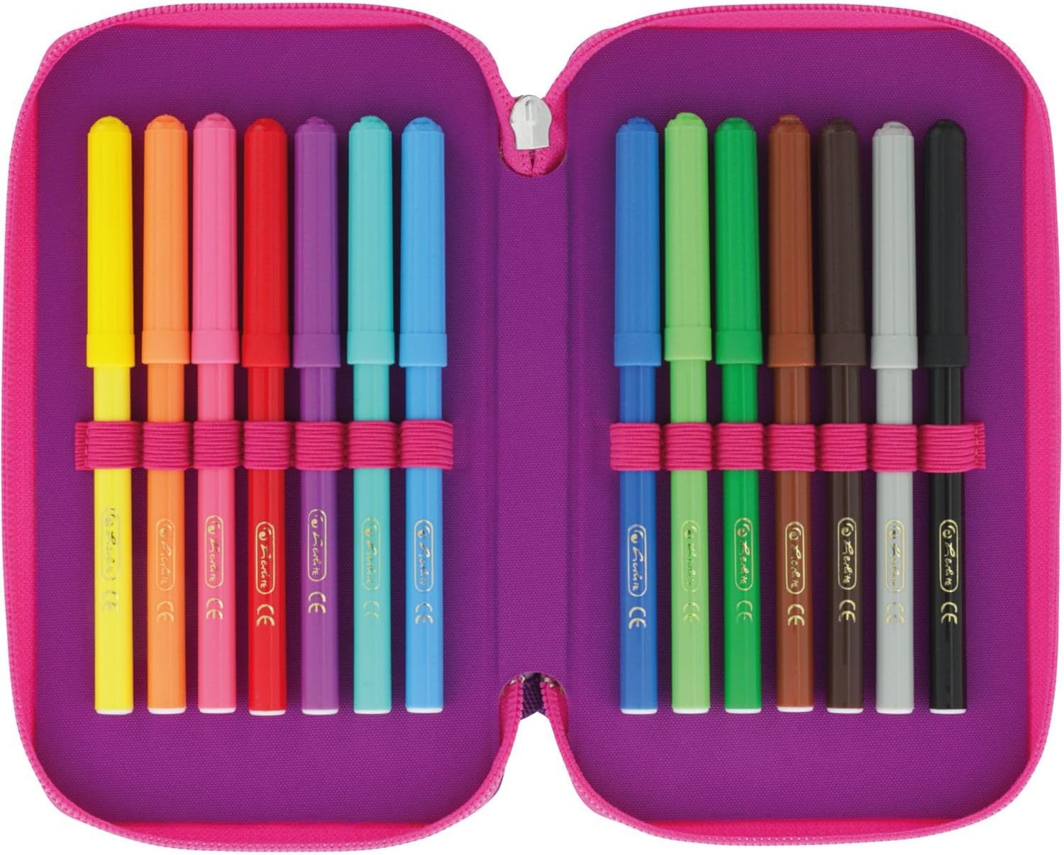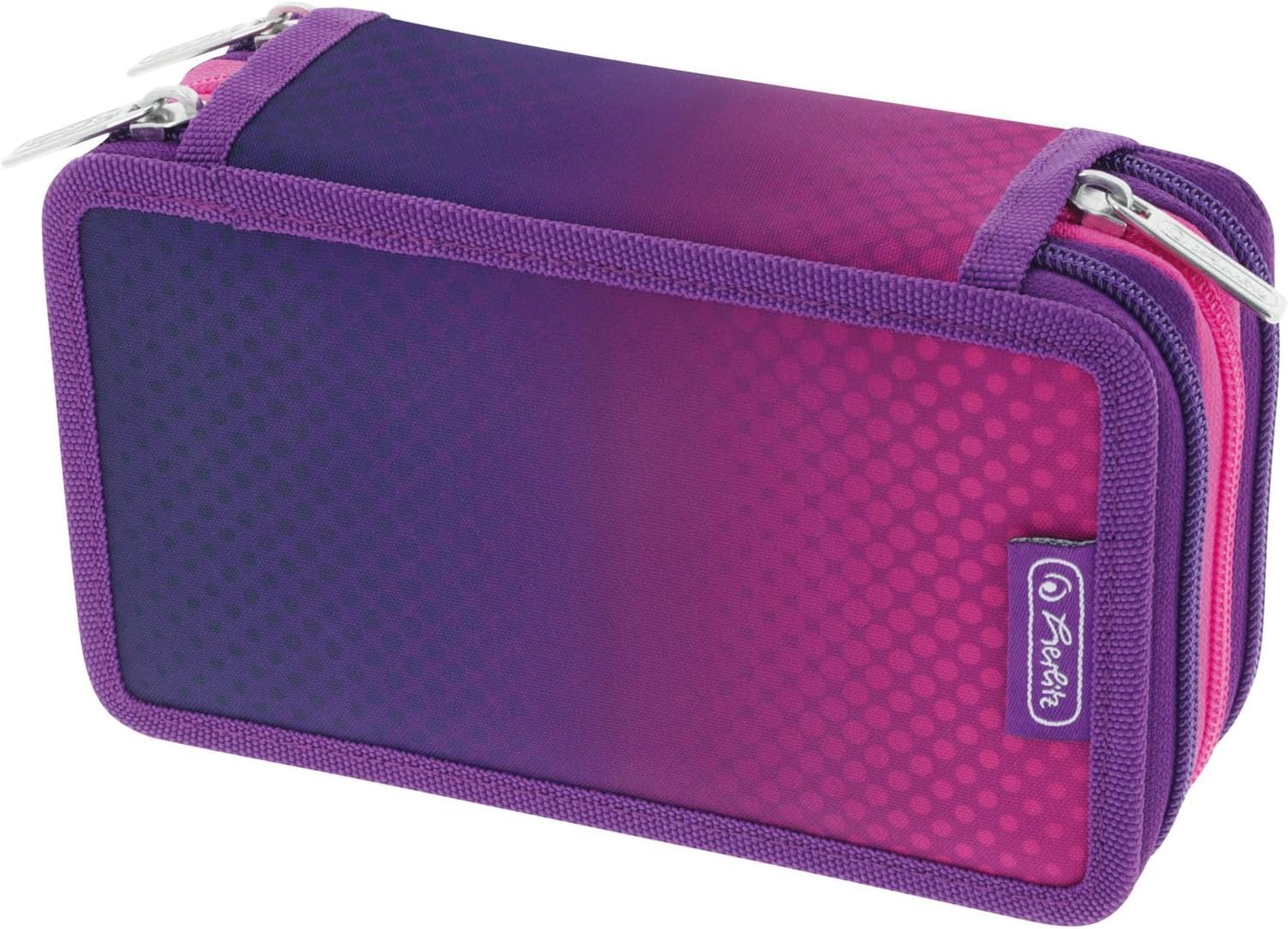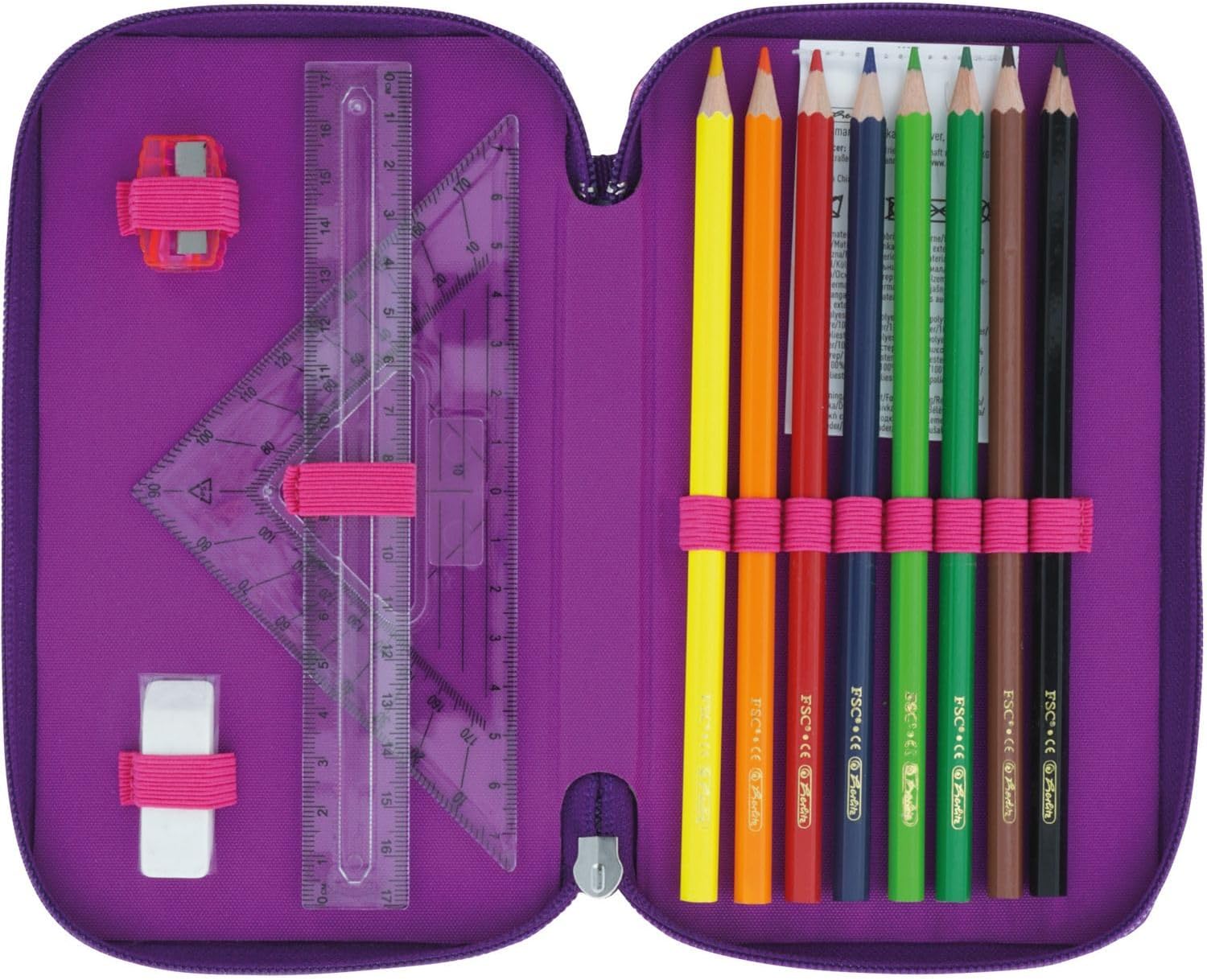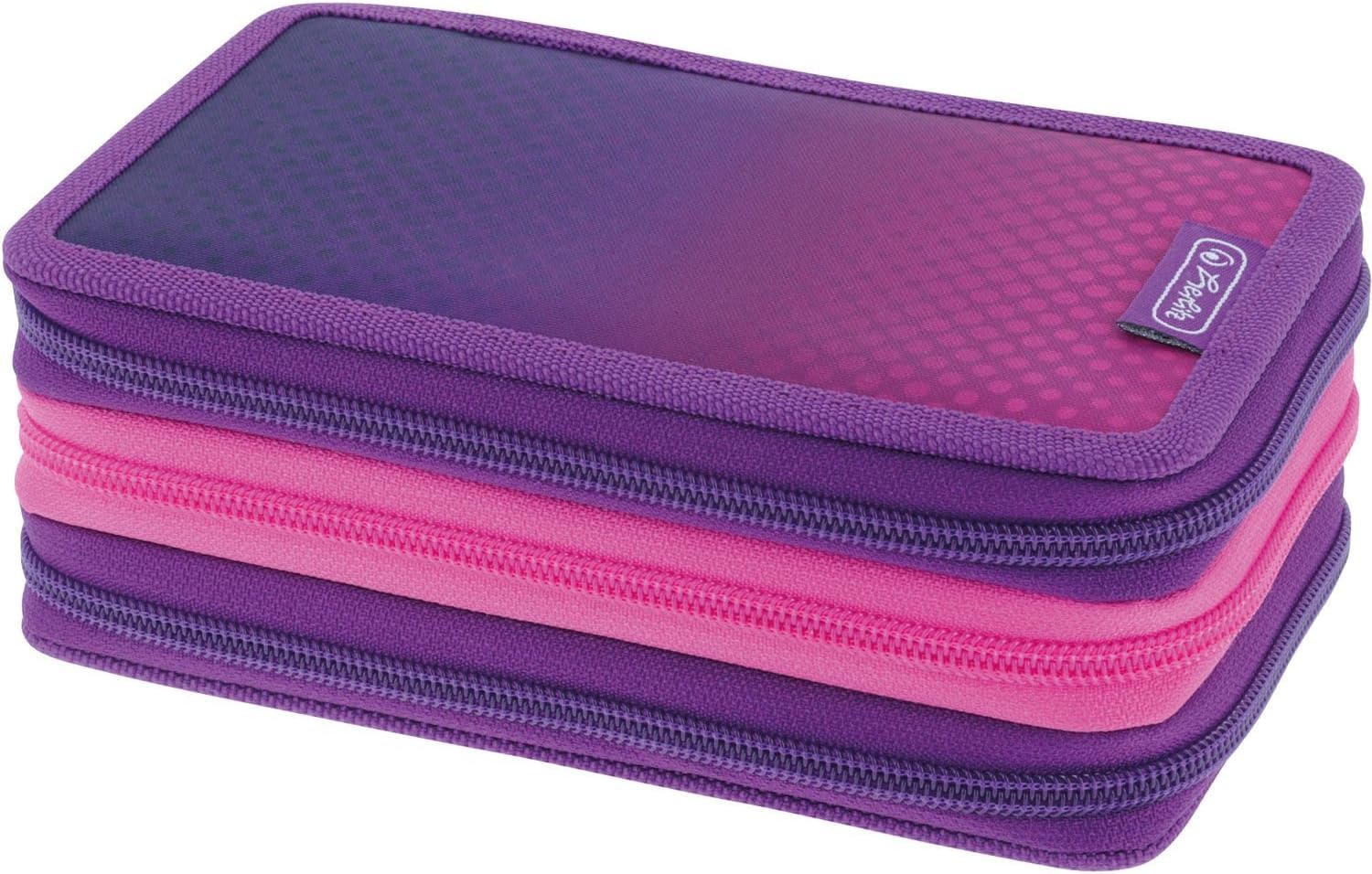 For school; university or work; 3 flaps with coloured zip; loops in different sizes; good overview; easy transport; coloured inner material made of PVC; dimensions: 19 x 11.5 x 7 cm; filling: pencils, pencils, ruler, triangle; material: polyester; design: dip dye pink/purple