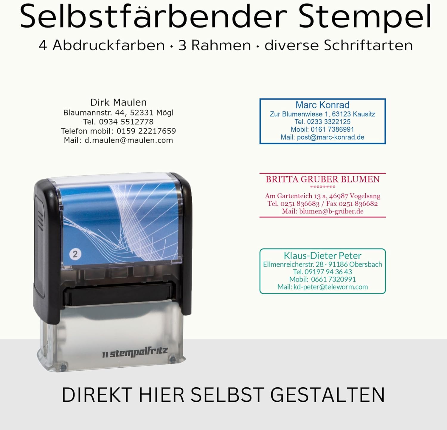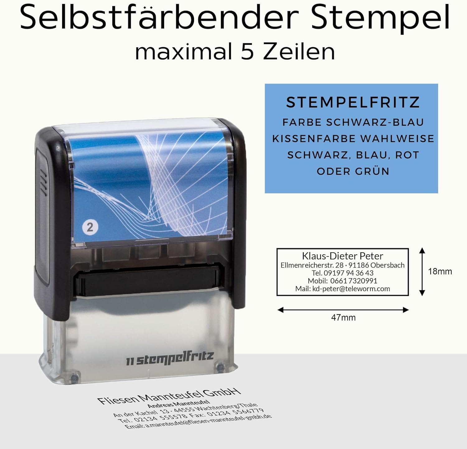 Be the first to review “Self-Inking Stamp stempelfritz Size 2 direkt hier Erstellen – Personalised Company Stamp, Address Stamp, Name Stamp or Family Stamp – Case Black-Blue, 47 x 18 mm, Max. 5 Lines”