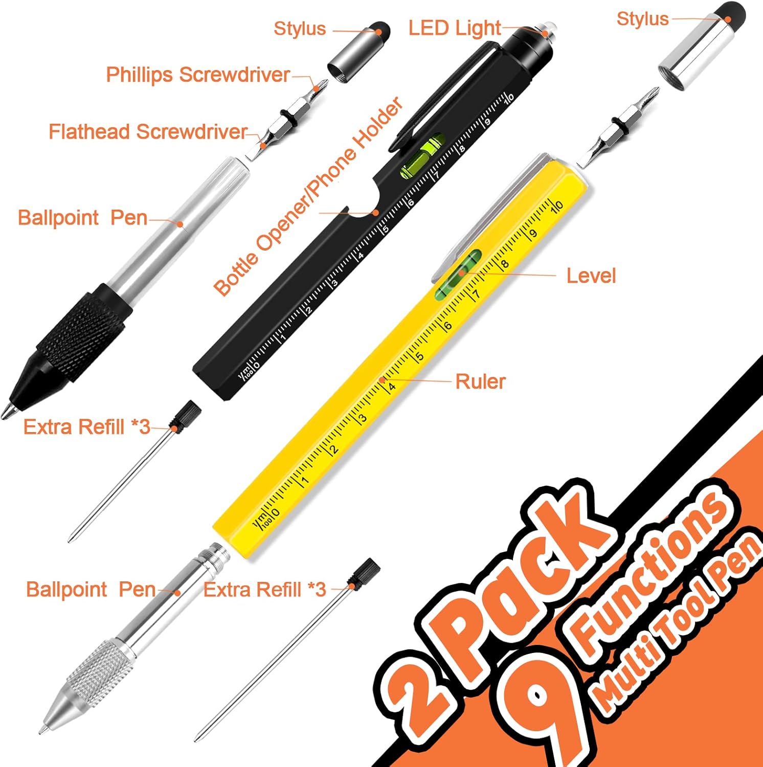 [ 9-in-1 Multifunctional Pen Set ] – KEZKALS multifunctional tool pen set comes with a 9-in-1 multifunctional pen and a 6-in-1 multifunctional pen, including the following practical functions: twist ballpoint pen / ruler / screwdriver (flat & phillips) / bottle opener (can act as a phone holder)/stylus/level/LED torch. This perfect pen can meet all your work requirements!