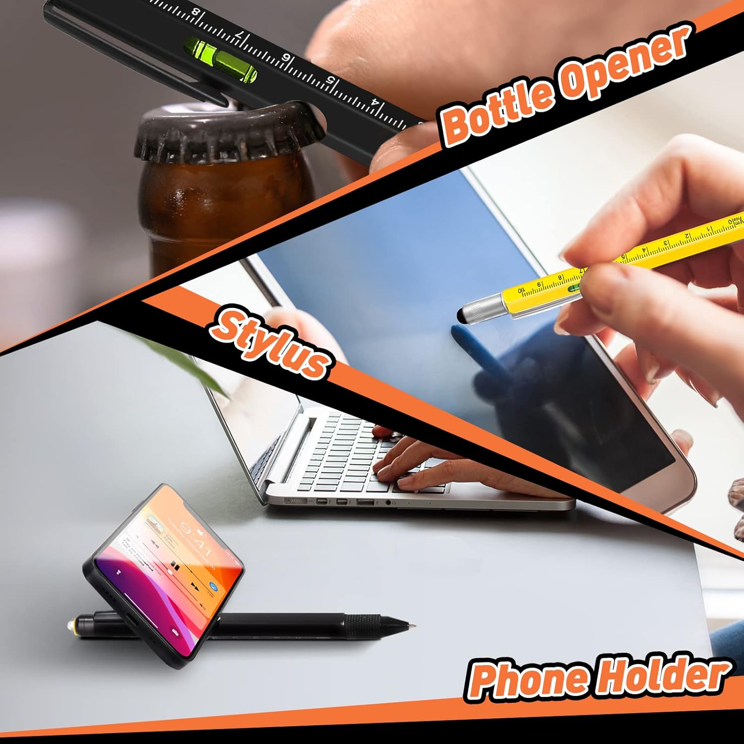 9 useful functions Screwdriver (Flat & Phillips) Ballpoint pen LED Flashlight Bottle opener Phone holder rulers level Touch pen