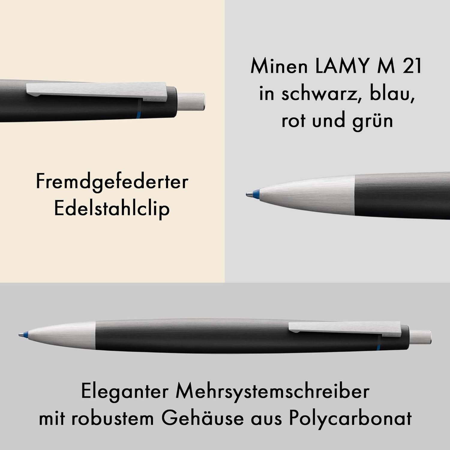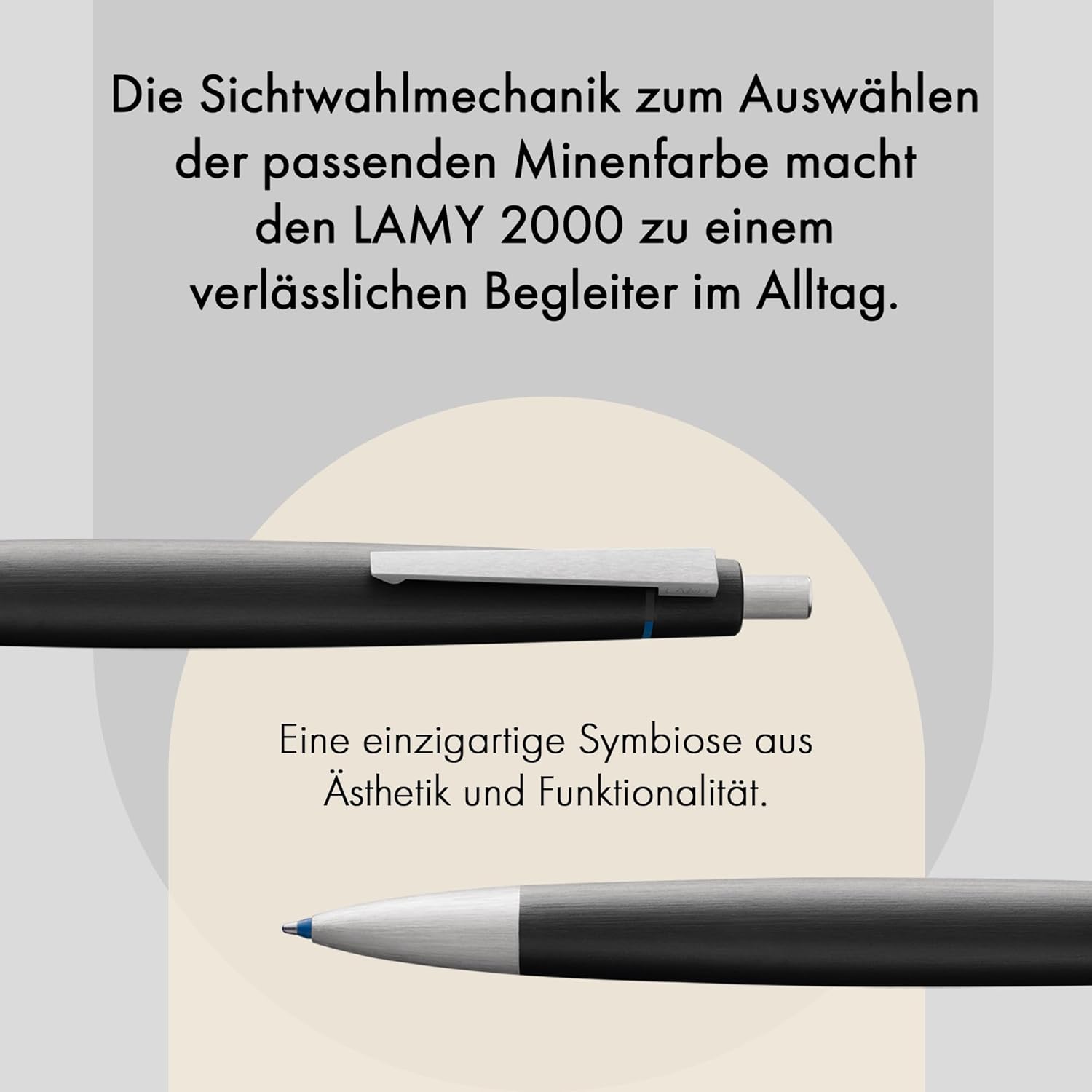„Lamy 2000 multi-system writer. Since 1966, the Lamy 2000 has been writing design history. As a timeless classic, it is still one of the most modern writing instruments. Multi-coloured ballpoint pen with push button mechanism and automatic visual selection. With Lamy M 21 ballpoint pen refills in black, blue, red and green. Brand description: A company with tradition: founded in 1930 by C. Josef Lamy the ink flow technology of the „“““Tintomatik““ of the LAMY 27 leads to the brand breakthrough. The next milestone took place in 1966 with the Lamy 2000 fountain pen. Since then, Lamy’s quality promise has been consistently reflected in every product. Lamy stands for responsible use of ecological, economic and social resources. This is evident from the consistent quality control of the materials and the manufacturing process to the recycling process. The fountain pens are designed for long-term use and thus fulfil the sustainability aspect: that’s what Lamy stands for with its quality promise