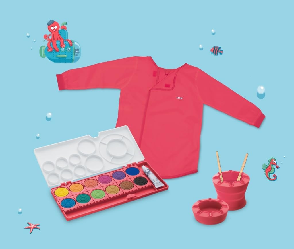 Lamy aquaplus children’s painting coat brilliant paint and mix perfectly. Children’s painting coat to protect clothes available in red, black and blue. The Lamy aquaplus coat is made of polyester and is washable at 30 °C