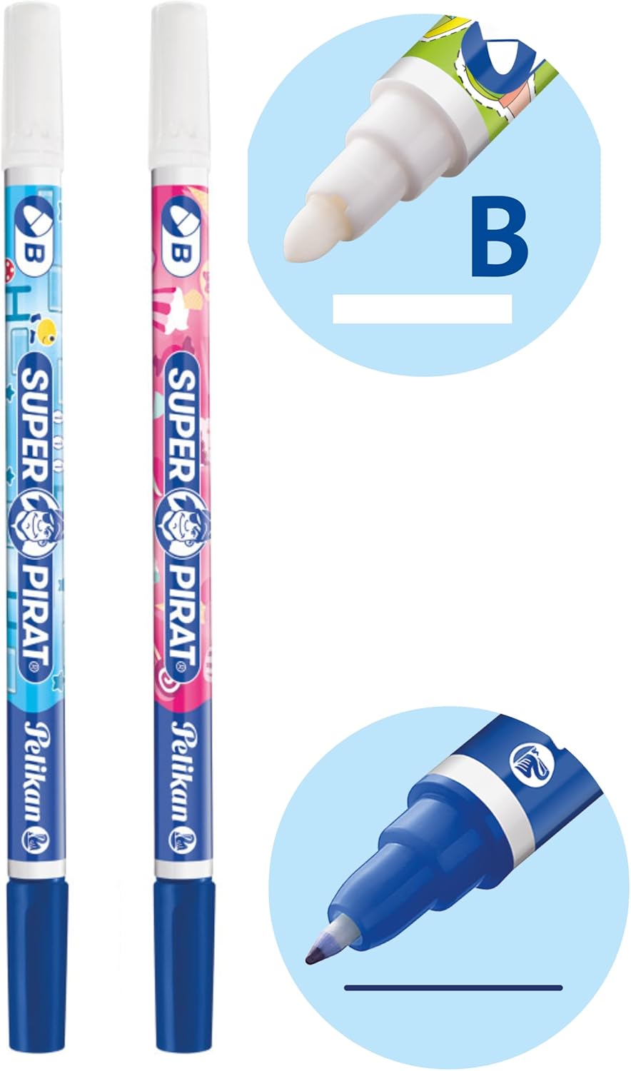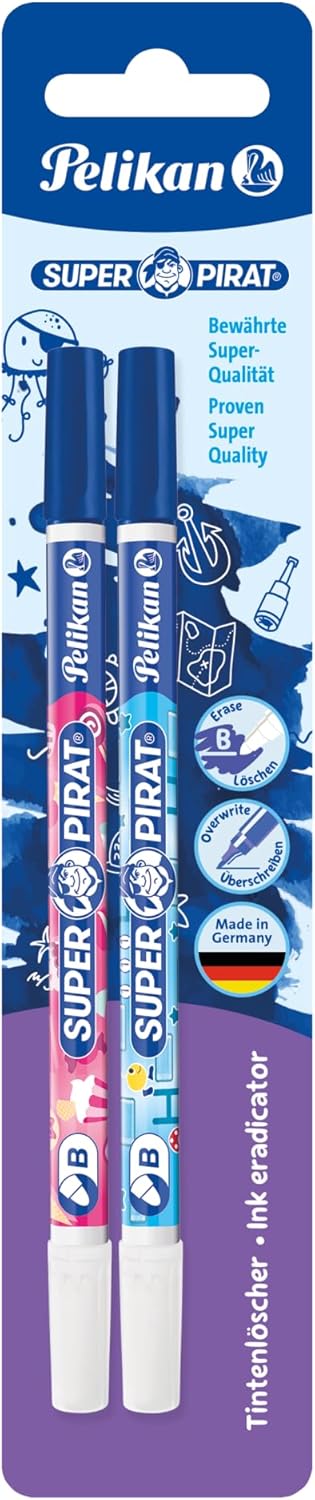 Four newly developed designs Super-Pirat Ink Killer available in F and B sizes Effortless correction. Blue overwrite tip Made in Germany Pelikan ink killer erase blue ink
